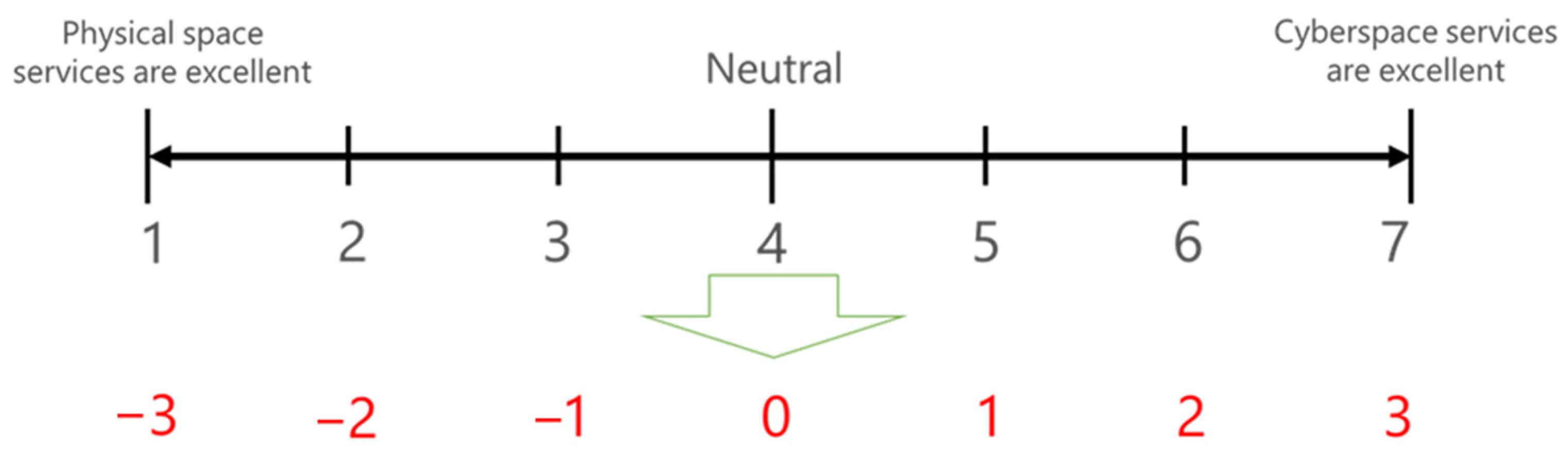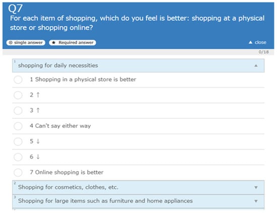 The respondents were asked if services offered in physical space are better, or if services offered in virtual space are better, considering several items such as travel time, cost, stress, quality, convenience, etc. For instance, as shown in Figure 4, respondents were asked “For each item of shopping, which do you feel is better: shopping at a physical store or shopping online?” where several shopping items were listed such as shopping for daily necessities, shopping for cosmetics, shopping for large items, cost other than shopping, shopping time, travel stress, etc. Subsequently, to numerically calculate the value of physical and digital alternative services based on each service item, numbers 1 to 7 are assigned to −3 to 3 as shown in Figure 5.