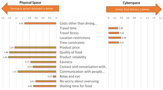 Individuals were asked if they feel physical (in-restaurant) dining is better or if online food delivery is better, considering several evaluation items. Physical (in-restaurant) dining refers to dining activities performed outside of the home. As shown in Figure 7, the survey results disclose that, similar to shopping, online food delivery is preferred considering accessibility-related items such as travel time, travel stress, location, and time constraints. In contrast, dining in actual restaurants is preferred, considering the non-related accessibility items such as costs, quality, reliability, convenience, and social interactions. The result confirms that, similar to shopping, the digital alternative substitution is highly influenced by accessibility-related factors in the case of dining.