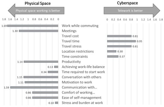 Through the web-based questionnaire survey, individuals were asked if they feel physical (in-office) working is better or if telework is better, considering several evaluation items. The results disclosed that teleworking is weighted higher by varying degrees, considering the accessibility-related items as shown in Figure 8. Meanwhile, physical (in-office) working is weighted higher considering non-accessibility-related factors such as working while commuting, work productivity, self-management, and social interactions.