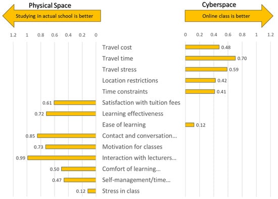 Through the web-based questionnaire survey, individuals were asked if they feel physical (in-school) learning is better or if e-learning is better, considering several evaluation items. Similarly to shopping, dining, and working, the results disclosed that respondents prefer e-learning considering the accessibility-related items, but physical learning value is weighted higher considering social interaction in the school, learning effectiveness, satisfaction with tuition fees, motivation, self-management, and convenience, as shown in Figure 9. The result discloses that accessibility-related factors can be a potential driver for digital alternative substitution in the case of schooling as well.