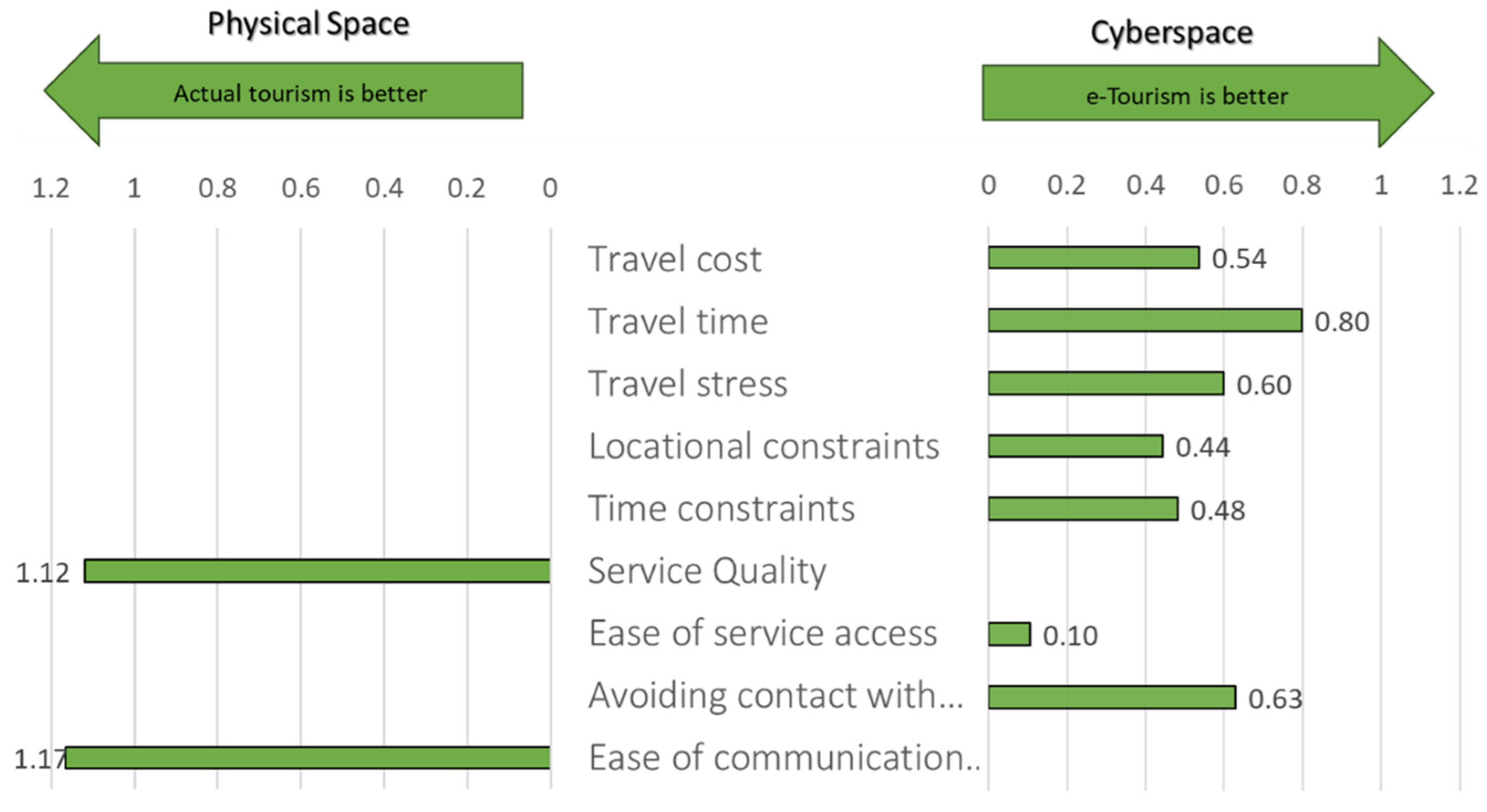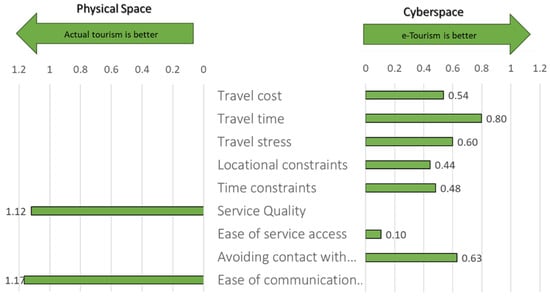 Through the web-based questionnaire survey, individuals were asked if they feel physical (in-spot) tourism is better or if e-tourism (virtual tours) is better, considering several evaluation items to evaluate the value of the services and factors affecting it. It was found that, similar to hospital visits, the individuals prefer e-tourism because of accessibility-related items, avoiding contact with others, and ease of service access, as shown in Figure 11. In contrast, the preference of individuals towards physical hospital visits was strongly influenced by service quality and social interaction items. The result confirms that accessibility-related factors, in addition to avoiding contact with others, positively affect the substitutability of actual tourism for a digital alternative, whereas the strong reluctant factors are service quality and social communication.