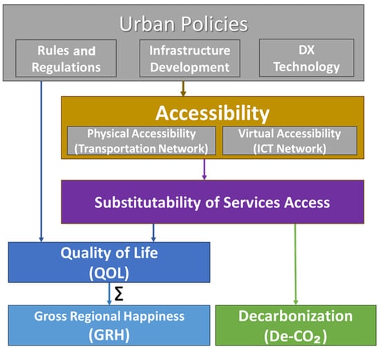 To consider the effects of the substitutability of services on the individual’s QOL while evaluating different urban policies and scenarios, this study has developed a framework based on survey results and literature reviews that presents the interaction of urban policies, accessibility, substitutability, QOL, Gross Regional Happiness (GRH), which is the overall QOL, and De-CO2, as shown in Figure 12.