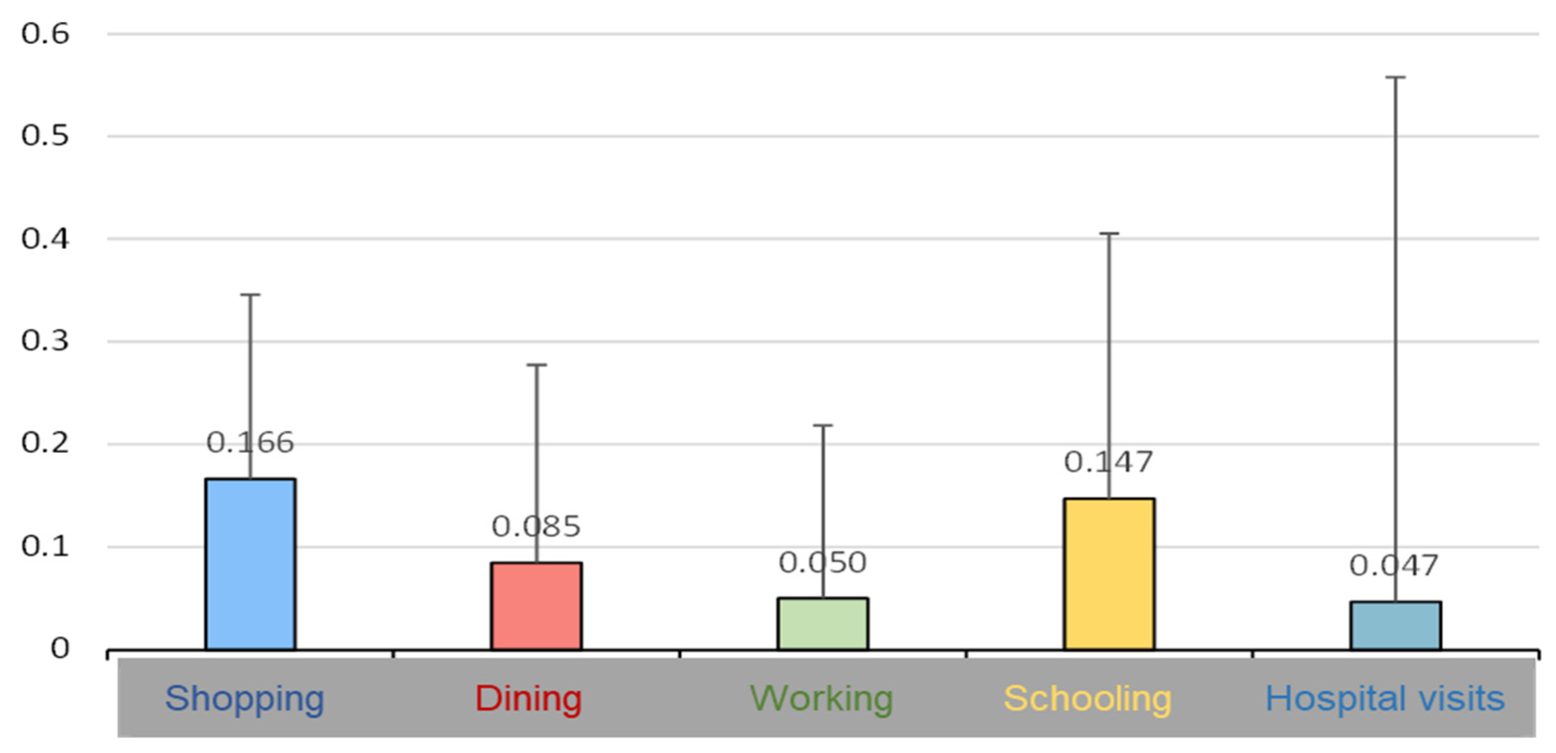 The “substitution ratio” is calculated by comparing how often individuals engage in real activities and their digital counterparts. Figure 2 illustrates the substitution ratios across the five activity categories based on the survey results. Survey results disclose clear variations in substitutability. Shopping and schooling exhibited significantly higher levels of substitution ratios up to 16% and 14%, respectively. In contrast, working and hospital visits exhibit the lowest levels of substitution, with only about 5% of participants frequently opting for digital alternatives. This low substitution rate is likely due to the inherent nature of these activities, which often require physical presence (e.g., attending medical appointments or physically being present at work).
