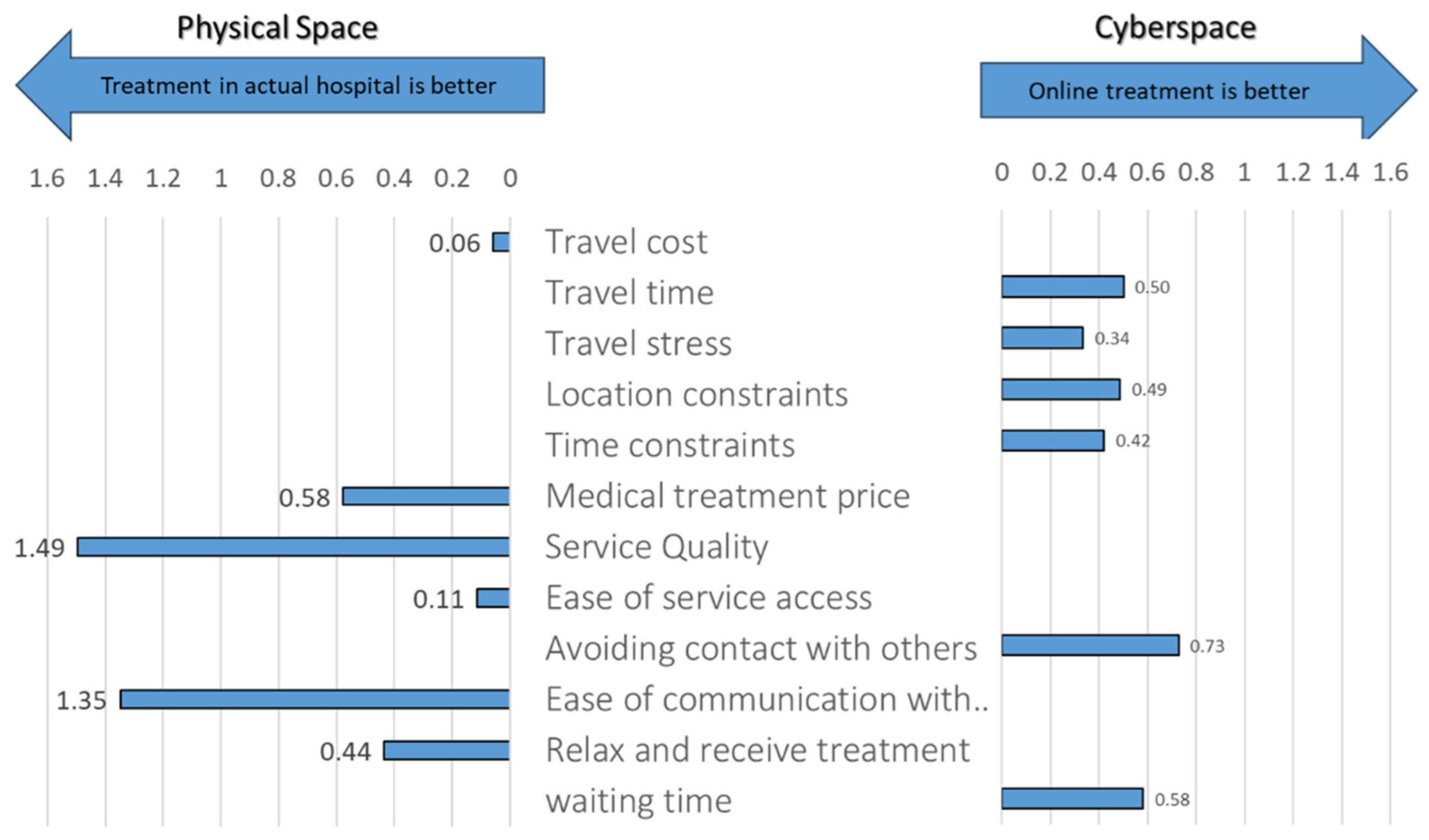 Through the web-based questionnaire survey, individuals were asked if they feel physical (in-hospital) treatment is better or if online treatment is better, considering several evaluation items to evaluate the value of the services and factors affecting it. The result discloses that, in addition to accessibility-related factors, avoiding contact with others and waiting time are the other factors that weigh more heavily on the online treatment, as shown in Figure 10. In contrast, service quality, social communication, treatment price, and convenience are factors influencing individuals to prefer physical (in-hospital) treatment.
