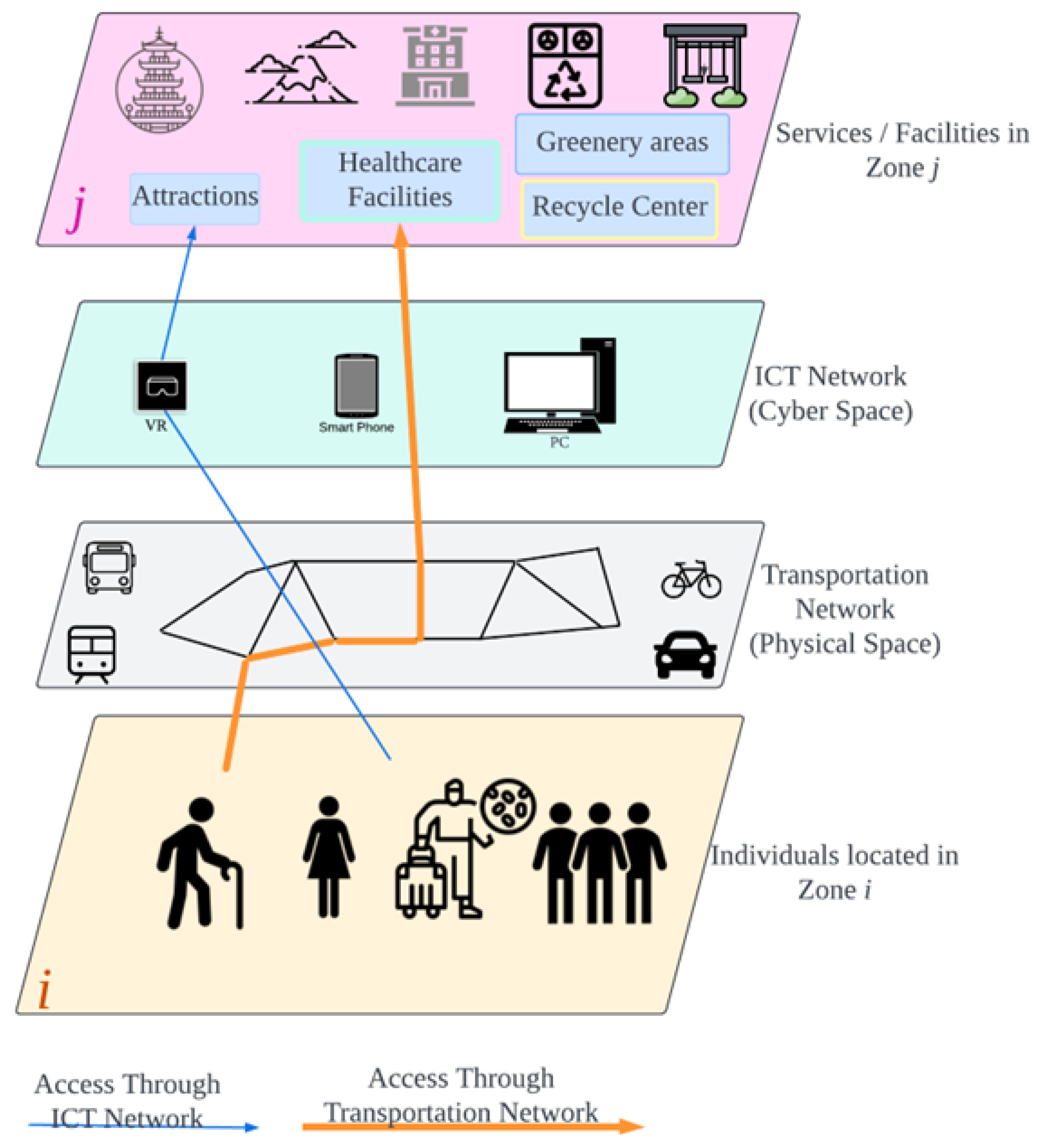 This study develops an integrated evaluation methodology to evaluate an individual’s QOL, considering their accessibility through real and virtual networks. The study adapts and modifies an existing QOL evaluation model [] to cope with the objective of this study. The QOL evaluation concept is illustrated using multi-layer networking in Figure 13, which explains the accessibility of individuals to the facility and services through transportation and ICT networks and presents the integrated methodology to evaluate QOL through both networks. Different individual categories may use different modes of ICT or transportation to reach the facility or receive services. This study utilizes multi-layer networking techniques to illustrate the complex relationships among urban entities and structures. The study divides the QOL components into accessibility and non-accessibility components, and the accessibility components are also categorized into accessibility through real (physical) networks and virtual networks, as shown in Figure 14.