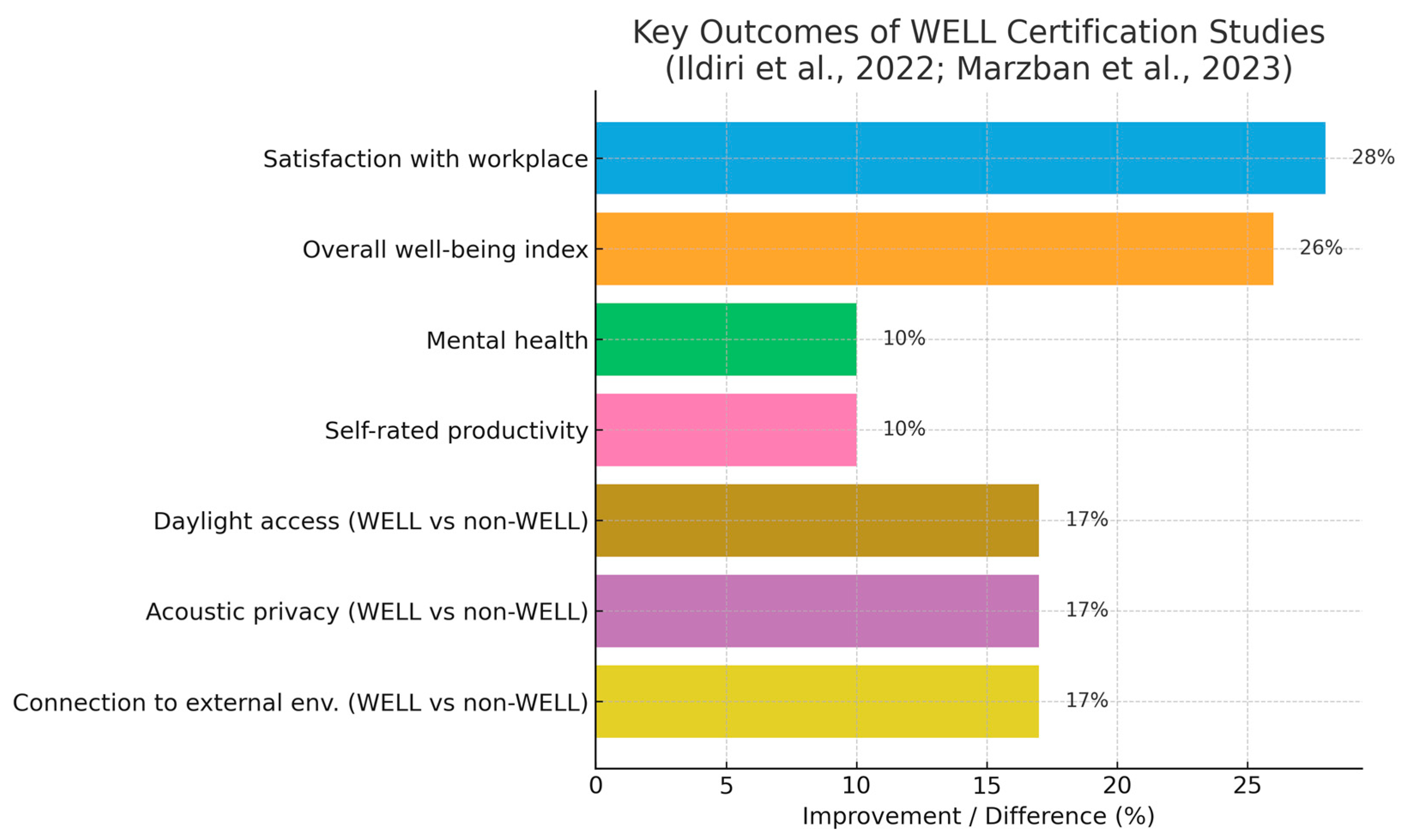 - Ildiri, N.; Bazille, H.; Lou, Y.; Hinkelman, K.; Gray, W.A.; Zuo, W. Impact of WELL certification on occupant satisfaction and perceived health, well-being, and productivity: A multi-office pre-versus post-occupancy evaluation. Build. Environ. 2022, 224, 109539. [Google Scholar] [CrossRef]