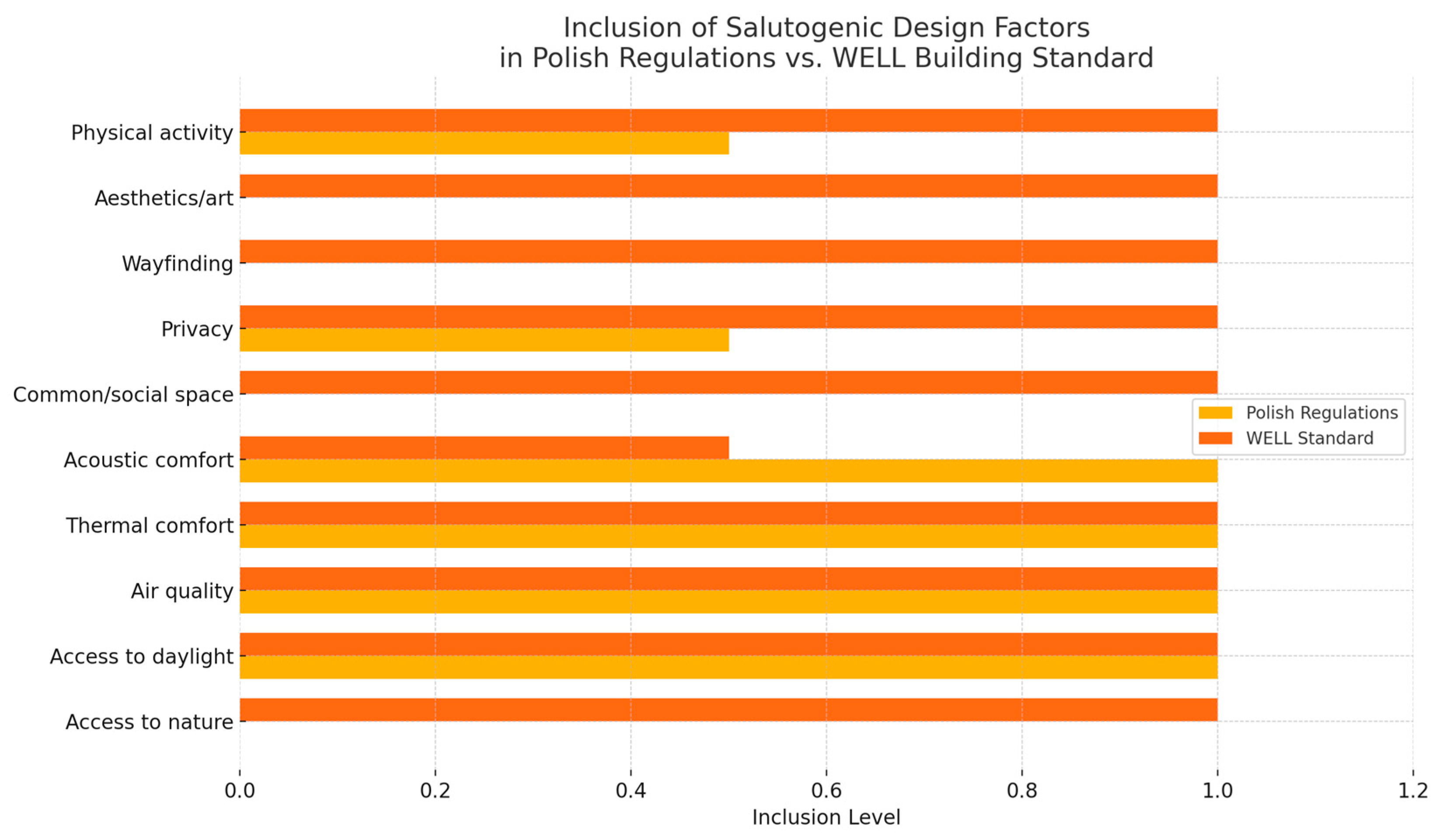 | 10 | Physical activity and movement | Partially—the regulations require infrastructure for activities only in specific cases (e.g., playgrounds at schools). Generally, there is no requirement, e.g., to encourage the use of stairs. | Yes—the standards (WELL Fitness) promote solutions that encourage exercise: availability of stairs, physical activity zones in buildings. |