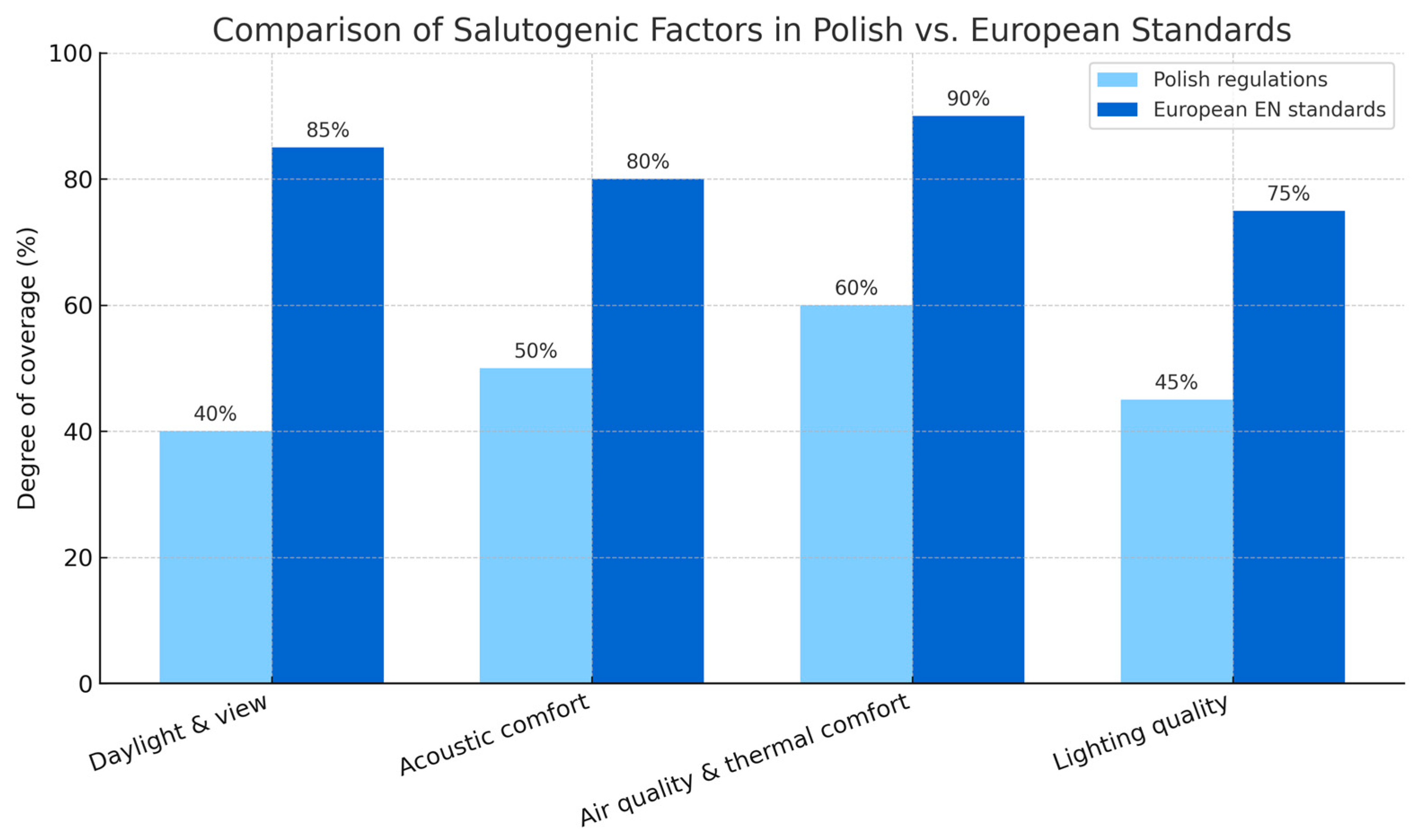 | 5 | Acoustic comfort | Yes—standards for acoustic insulation of partitions and permissible noise levels in residential and public buildings. | Partially—the standards recommend good acoustics (e.g., WELL Sound), although not always obligatory. |