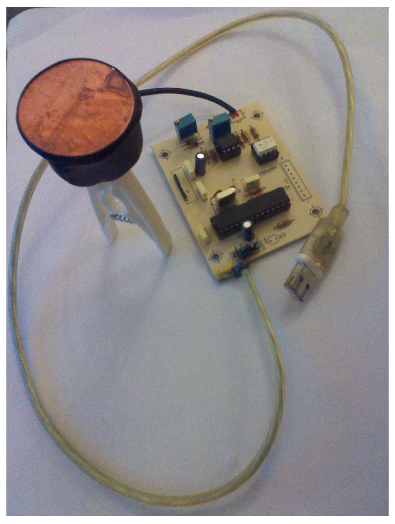 2. The lower disk, a few centimetres larger in diameter, acts as the anchoring base and contains the electronics. This disc has several holes to fasten itself with various solutions. The capacitor is made of flat faces of thin Cu metal layers, where the first layer is facing up and is electrically isolated from rain by a thin film. The second arm of the capacitor is grounded. Concerning the electric fields generated above the sensor, they are strongly shielded by the capacitor structure, and only the charges that touch the top disc can induce measurable intensity signals. The signal generated by the electrical induction of raindrops striking the upper face is connected to the electronics by a shielded wire. Of the two electronic parts, the first includes a high-impedance amplifier for the signal. The second part is a processor responsible for both ADC and computing the rain rates using a fast Fourier transform (FFT) and summing selected power spectral components. Consequently, the calculation of the rain rate is possible by measuring electrical pulses, calculated as the power spectral sum of electric non-stationary induced currents.