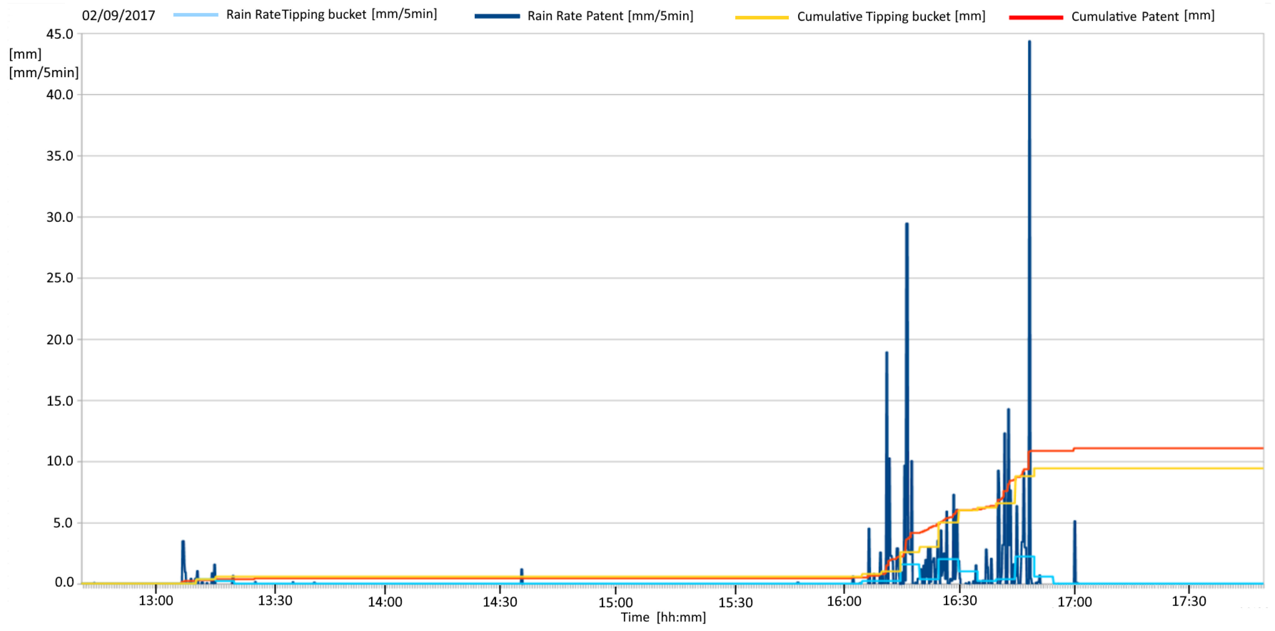 Figure 3. The light blue and dark blue lines represent the rain rates measured by the tipping bucket and patent instruments, respectively, while the yellow and red lines represent the cumulative values calculated by the same instruments, respectively. All of these measurements were reported in mm for cumulates and mm/5 min for rain rates, where 5 min was the interval of the tipping bucket instrument. The recording corresponded to an event on 2 September 2017, whose main phase took place at 16:00 LT. The rainfall unfolded in two phases. The first phase began at approximately 13:06, marked by light precipitation captured by both instruments, lasting for about 15 min and producing 0.6 mm of rainfall. The second discharge lasted for about one hour and deposited around 10 mm of water. Six light rain pulses occurred between 13:19 and 15:59 and were not detected by the tipping-bucket. They were characterised by the patent with durations between 10 and 30 s and cumulatives of <0.1 mm.
