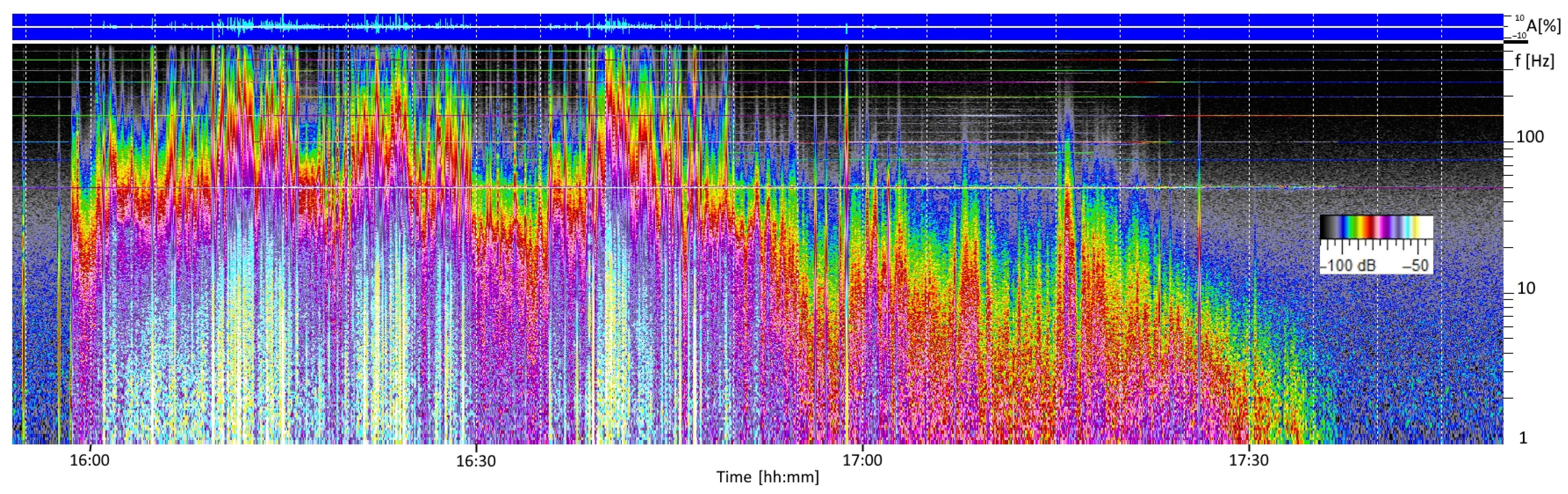 Figure 4, a few minutes before the first main event at 16:00. The numerous rain pulses of the main phase are shown in red colours, corresponding to a relative power of −80 dB, above 100 Hz. The logarithmic scale was used for the spectrogram so as to analyse the phenomenon for f < 100 Hz, whenever the electrodynamic contribution was due to fog or minute airborne water droplets. Indeed, tiny water droplets can stay airborne for several hours following rainfall. Thus, being that they are electrically charged, they release an ultra-low frequency signal when touching the sensor. Finally, the upper light blue line in the blue band in