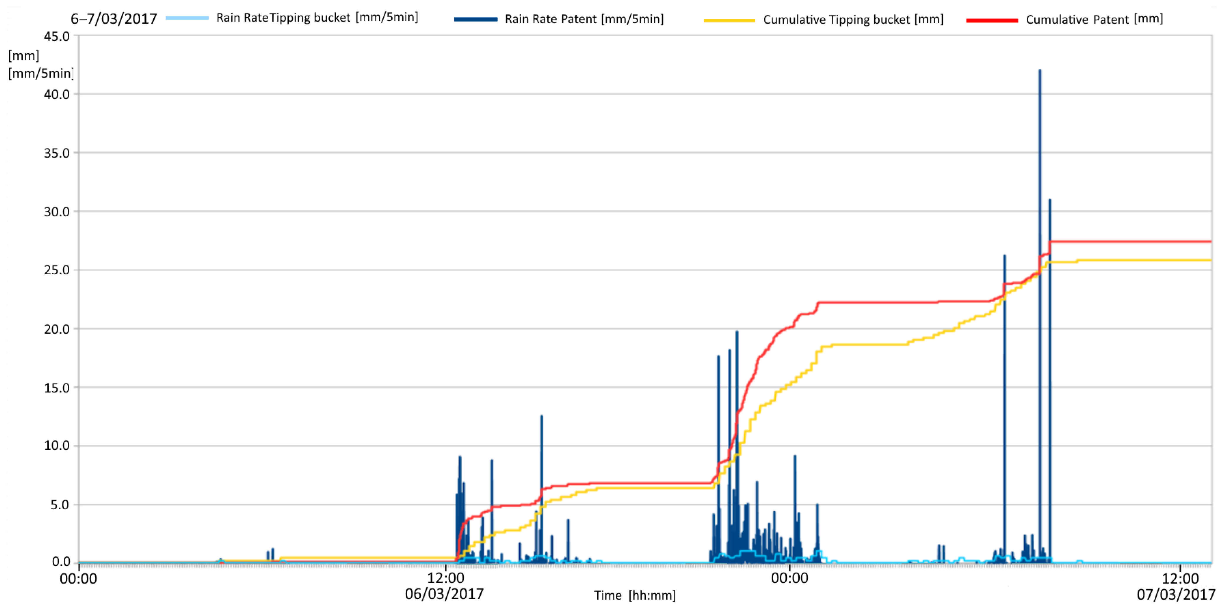 It was difficult to accurately evaluate the precision of the studied electrodynamic pluviometer because of the limited time and intensity resolutions of other instruments. An error was determined when comparing the instrument’s measurements with those of a known rain gauge of the available tipping bucket. The comparison was conducted on a medium-to-high intensity precipitation event, with high flash pulses of rain, during both nocturnal and daylight hours of a non-warm season, after the rain had already fallen on the instrument, avoiding the issues described above. The selected rain event occurred during 1.5 days between 6 and 7 March 2017, with a total cumulative amount of more than 27 mm, after the rain had already fallen on 5 March. This selected event was composed of three main phases with increasing intensity. Precipitation traces of 0.2 mm were recorded by both instruments at around 04:35 and 6:35 on 6 March 2017, with the electrodynamic patent underestimating rain quantities and anticipating measurements of 10–15 min. Then, the first main phase lasted for about 5 h from 12:20, with a maximum rain rate of more than 12 mm/5 min reached at 15:07, and a cumulative of 6.4 mm was recorded by the tipping bucket, while 6.8 mm was recorded by the patent. The second main phase lasted for 4 h, starting at 20:40, with a maximum rain rate of around 20 mm/5 min reached at 21:30, and a cumulative of 12.2 mm was recorded by the tipping bucket, while a cumulative of 15.4 mm was recorded by the patent. The third main phase lasted for about 2 h from 05:50 on 7 March 2017, preceded by intermittent weak events, with a maximum rain rate of around 42.0 mm/5 min reached at 07:23, and a cumulative of 8.8 mm was recorded by the tipping bucket, while 5.2 mm was recorded by the patent. Major cumulative differences between the two instruments appeared with the major rain rate, as shown in