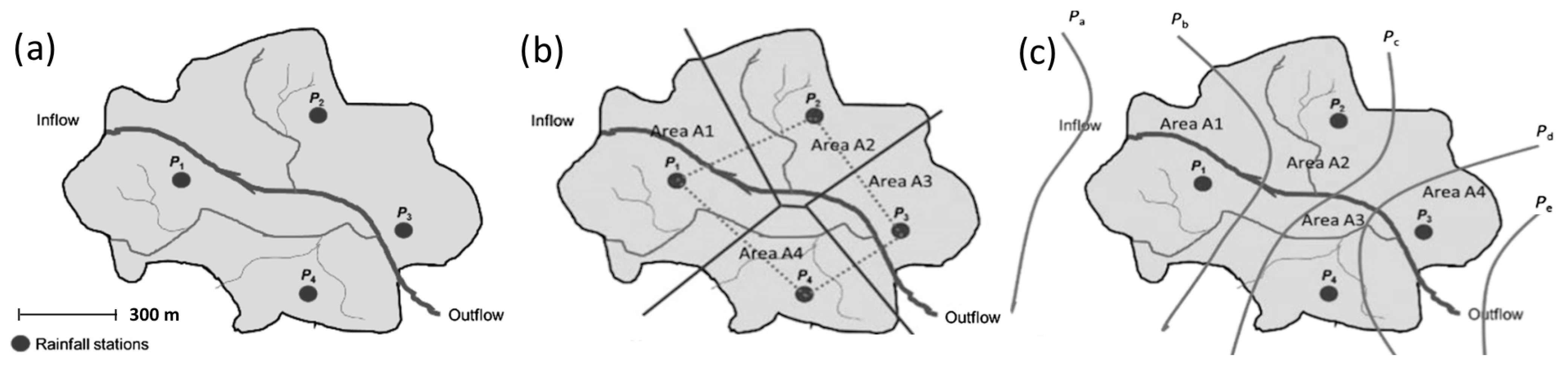 71], with the following daily average rainfall: P1 = 12 mm, P2 = 18 mm, P3 = 36 mm, and P4 = 28 mm. The estimated arithmetic average areal rainfall was 23.5 mm for the a) model. At the same time, the uncertainties calculated as standard deviations were uTB = 1 mm and uED = 0.5 mm, where TB indicates the tipping-bucket gauge and ED the electrodynamic gauge. The Thiessen polygon model had the same Pi as above, with the same areas used in the cited work, where A1/A = 0.37, A2/A = 0.24, A3/A = 0.20, and A4/A = 0.19; the standard uncertainty was u(Ai/A) = 0.01; and the weighted mean was 21.3 mm. Meanwhile, the uncertainties calculated as standard deviations were uTB = 1 mm and uED = 0.67 mm. The c) model produced Pa = 6 mm, Pb = 15 mm, Pc = 24 mm Pd = 32 mm, and Pe = 44 mm, with A1/A = 0.31, A2/A = 0.28, A3/A = 0.23, and A4/A = 0.18; a standard uncertainty of u(Ai/A) = 0.01; and a weighted mean of 21.9 mm. Meanwhile, the uncertainties calculated as standard deviations were uTB = 1.2 mm and uED = 0.95 mm.