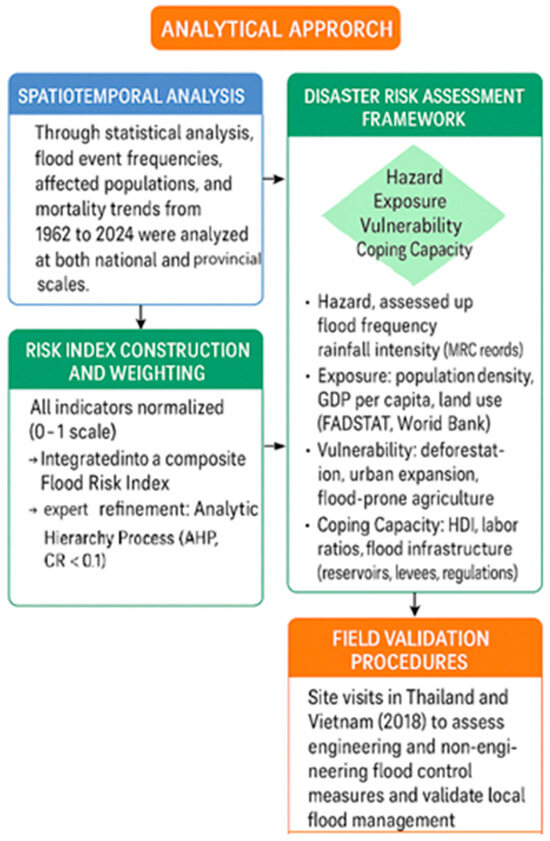 Field Validation Procedures: The analytical approach for this study is structured in Figure 1, which integrates spatiotemporal analysis, risk assessment, and field validation. Site visits were conducted in Thailand and Vietnam in 2018 to assess both engineering and non-engineering flood control measures in place. These visits aimed to validate the effectiveness of local flood management strategies and to provide ground-truth verification for flood risk assessments.
