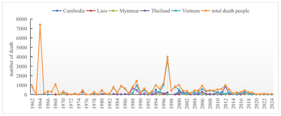 Annual variations in fatalities caused by floods in Mekong Basin countries (1962–2024).