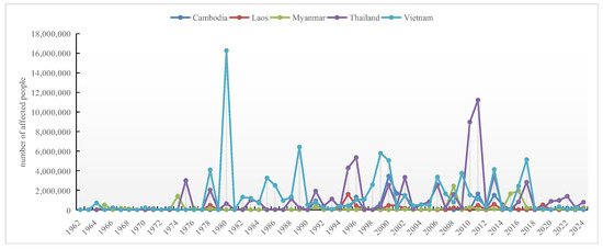Annual variations in flood-affected populations in Mekong Basin countries (1962–2024).