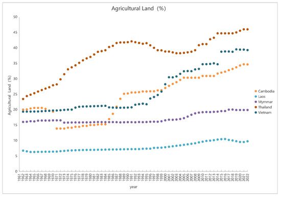 This land use transition has significant implications for the region’s hydrological regulation capacity. The conversion of wetlands and floodplains into agricultural areas reduces soil infiltration, intensifies surface runoff, and ultimately increases both the frequency and severity of flood events [27,38]. In Vietnam, for example, agricultural encroachment into flood retention zones has diminished flood absorption capacity [27,30], while expansion in Cambodia has exacerbated downstream flood risks [39,40,41]. Moreover, uneven agricultural expansion between upstream (e.g., Laos, Myanmar) and downstream (e.g., Vietnam, Thailand) countries has disrupted the spatial equilibrium of water resources and altered basin-wide flood propagation patterns. As shown in Figure 9, Vietnam’s agricultural land ratio surged after 1998, while Thailand’s growth plateaued after the early 1990s [29,30]. Overall, the decline in forest cover and the shift toward cropland contribute to altered natural hydrological regimes and increased vulnerability of agricultural systems to flood-related damage [27,33,42].