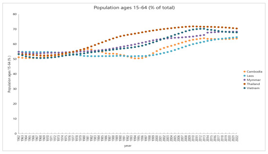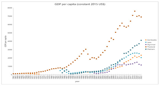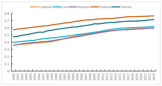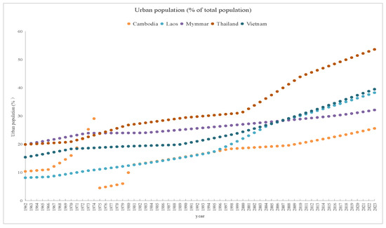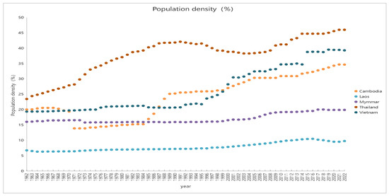 Population density (Figure 10) has risen markedly across all five countries, with Vietnam exhibiting the highest growth. High-density settlements in flood-prone areas—such as the Mekong Delta—have significantly elevated exposure levels and disaster vulnerability [27]. In Cambodia and Myanmar, densely populated riparian agricultural zones face dual challenges of ensuring food security and mitigating recurrent flood risks [43,44]. Even in relatively low-density countries like Laos, the concentration of populations in river valleys has created localized hotspots of flood exposure [45].
