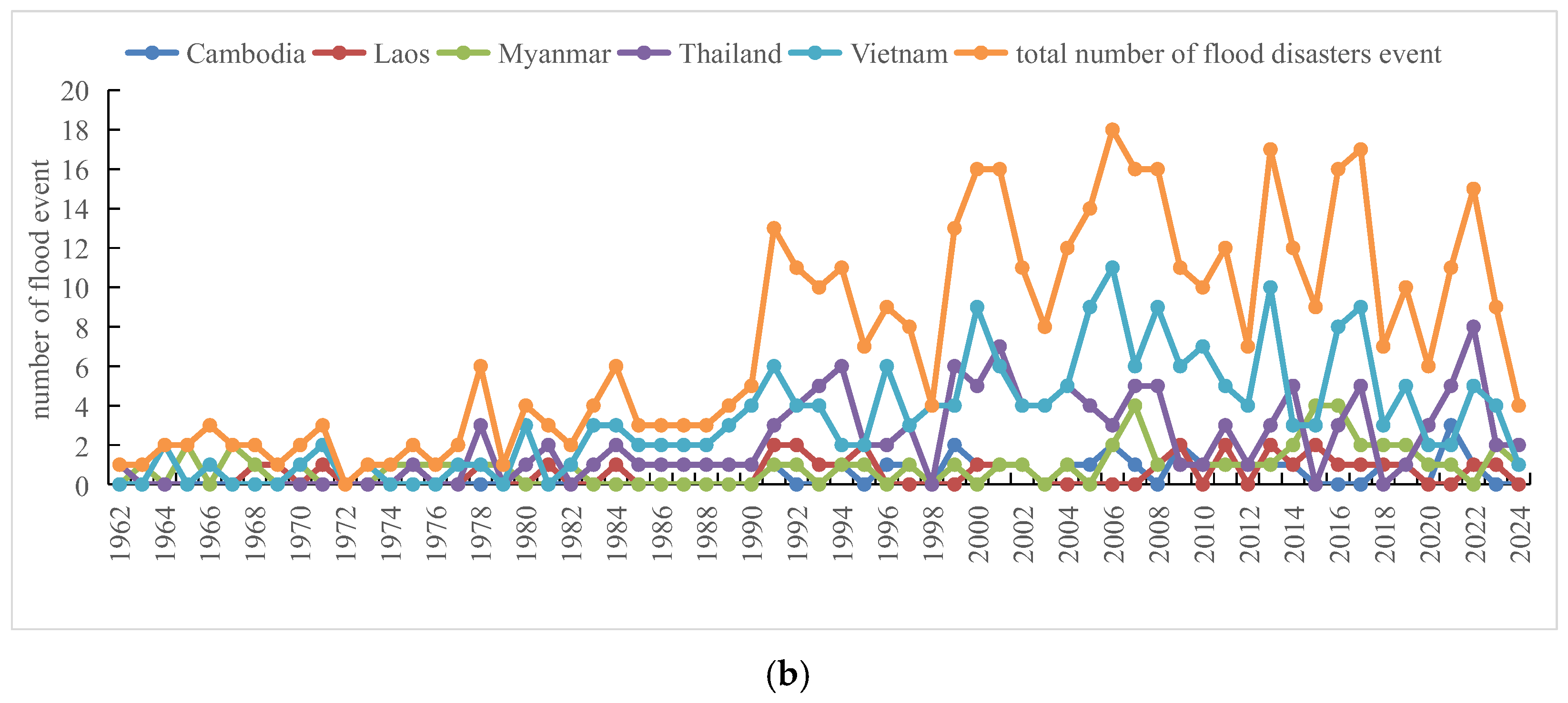 - Over the past 60 years, the frequency of flood disasters in the Mekong River Basin has shown an increasing trend, while overall casualties have decreased significantly. The frequency and severity of floods vary across countries, and flood events do not occur synchronously. Temporally, Laos, Myanmar, and Cambodia experience peak floods from July to November, while Vietnam and Thailand are affected throughout the year, though also mainly between July and November. Spatially, Vietnam, Thailand, Myanmar, and Cambodia experience frequent floods, with Vietnam showing the highest concentration of flood-prone provinces, especially in its central region and in Cambodia.