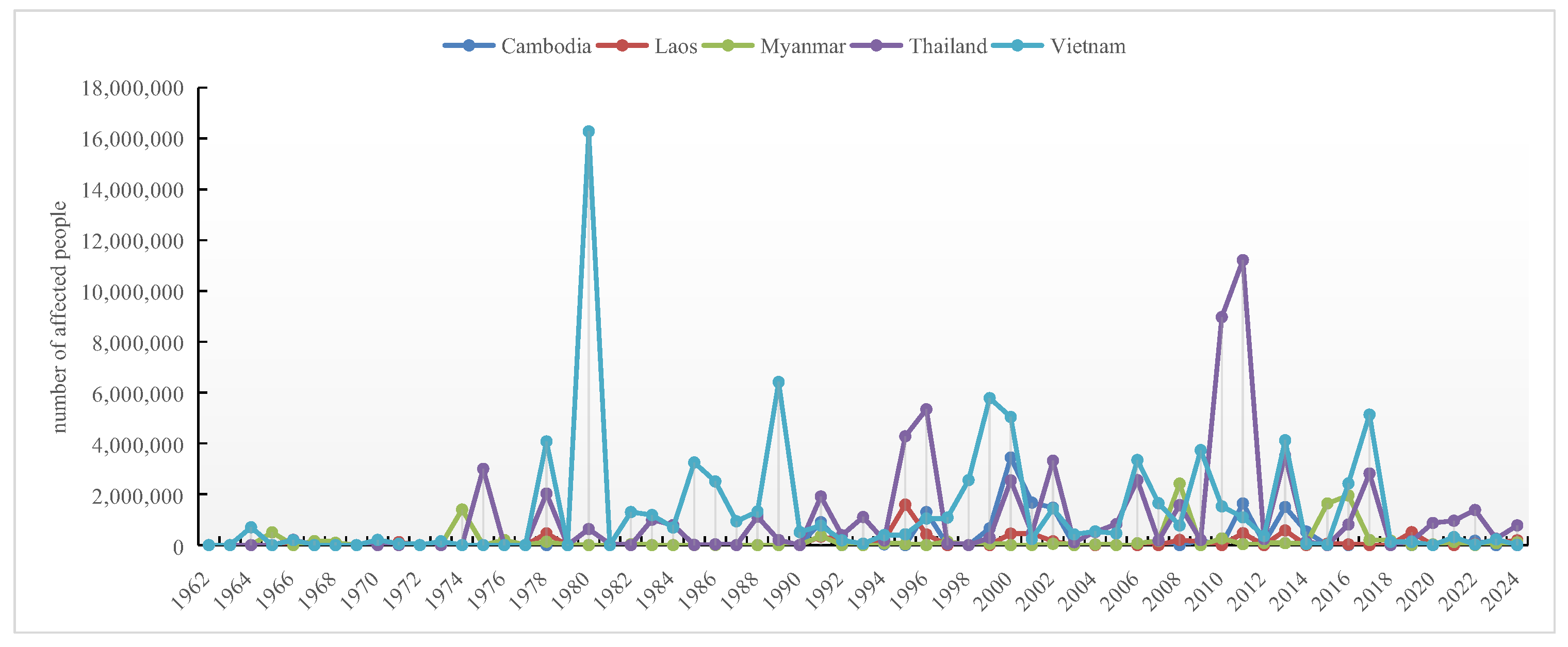 Figure 3), particularly in the central coast and Mekong Delta regions. Thailand faced catastrophic flooding in 2011, affecting over ten million people, primarily due to continuous heavy rain.