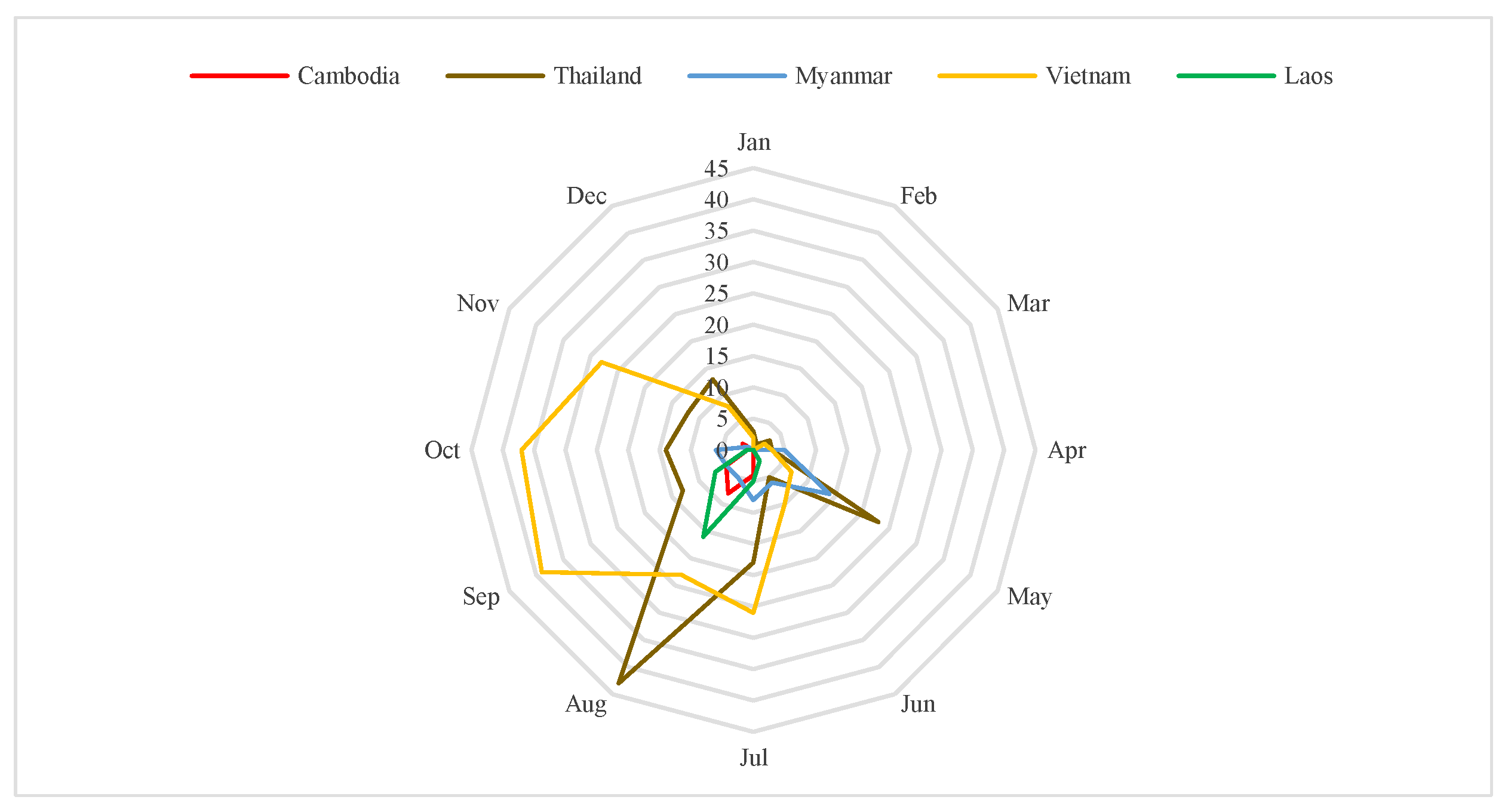 Figure 5) shows floods predominantly occur between July and November, aligning with rainy seasons. Vietnam and Thailand experience extended flood seasons into December, while Myanmar has a distinct May peak, influenced by Bay of Bengal cyclones. These patterns underscore region-specific preparedness needs.