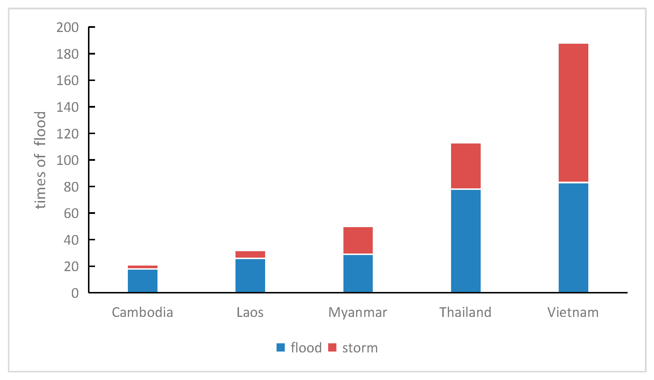 Figure 2b) shows Vietnam and Thailand experiencing both highest flood frequencies and greatest numbers of casualties.