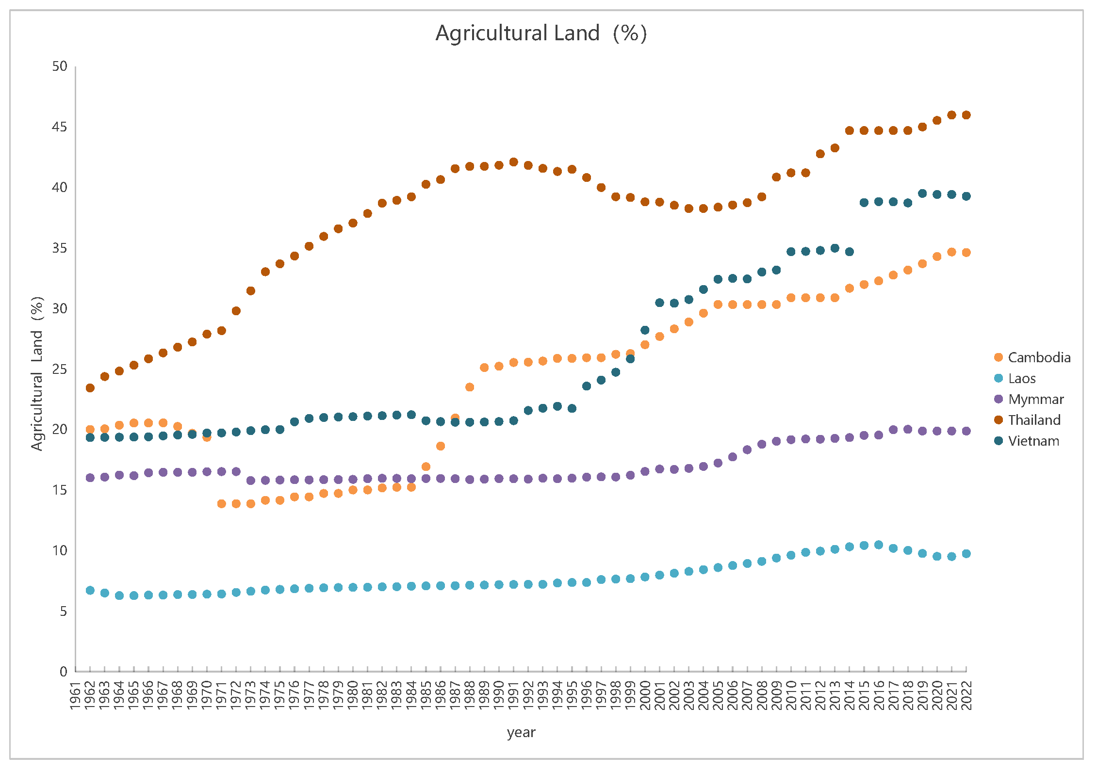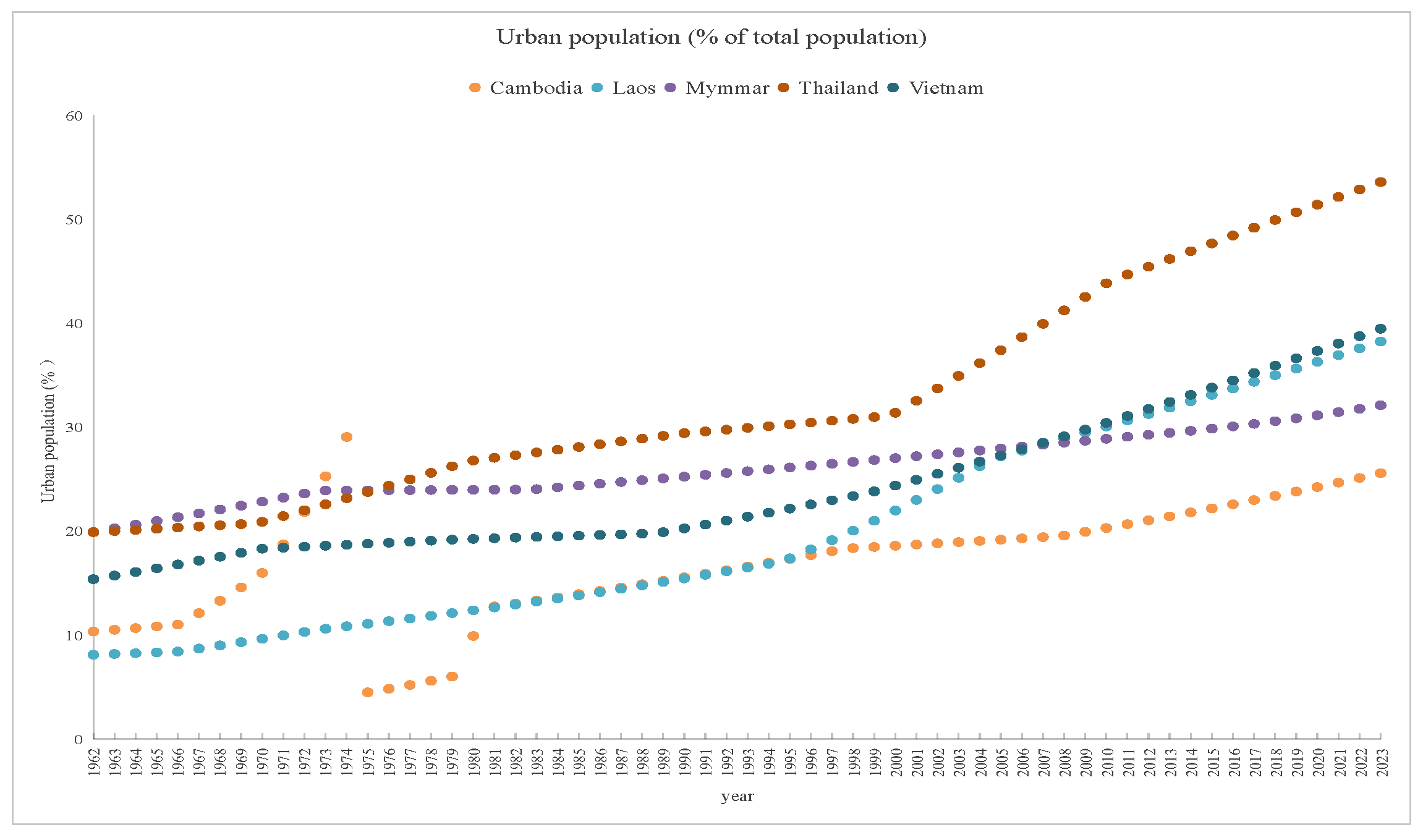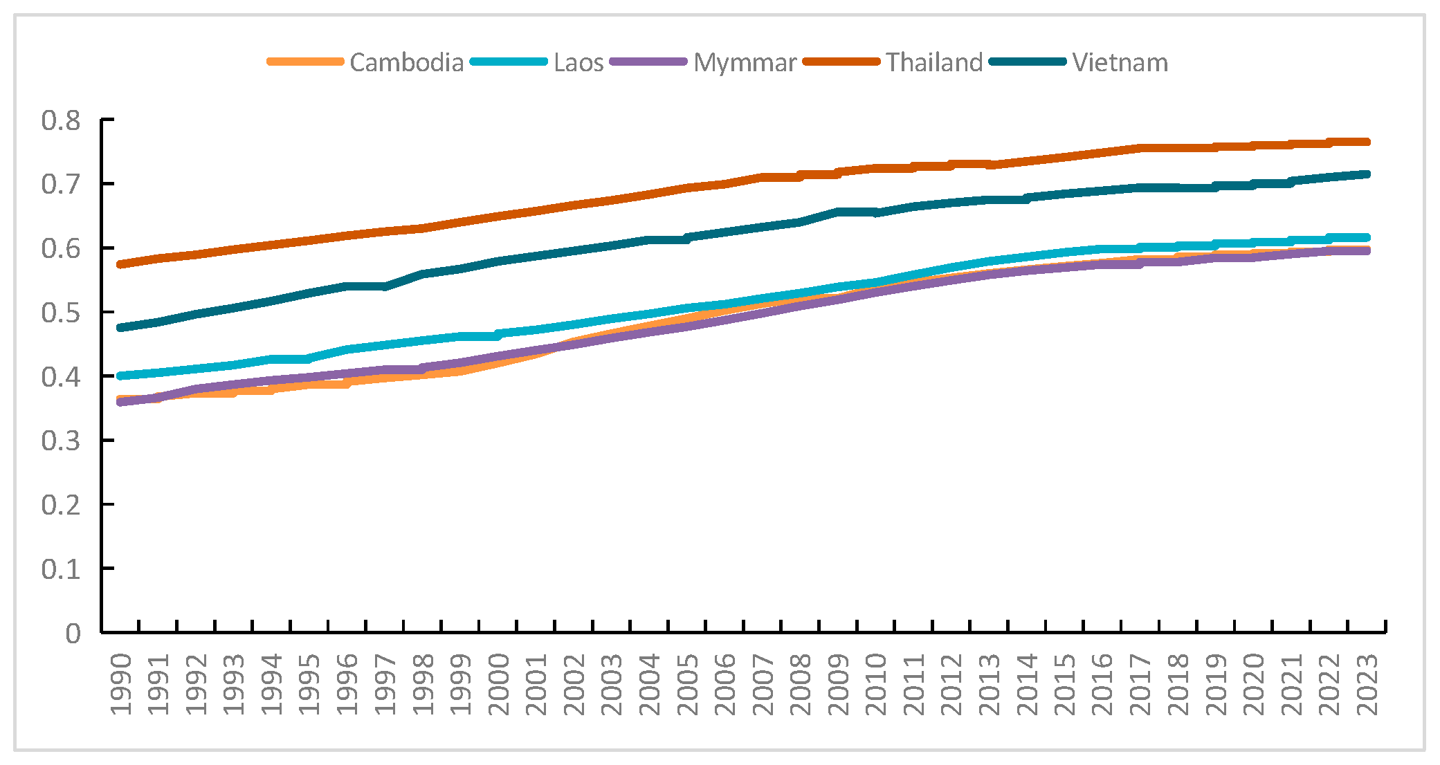 Figure 14 shows a steady upward trend in HDI scores for all five countries from 1990 to 2023.Judging from the trend of the curves in the graph, Thailand demonstrates a stronger adaptive capacity, with its HDI remaining at a relatively high level for a long time; Vietnam also shows a good performance. However, due to their relatively low starting points in social development, although the HDIs of Cambodia and Myanmar are on an upward trend, their absolute values are still lower than those of Thailand and Vietnam, leaving them in a relatively vulnerable state [