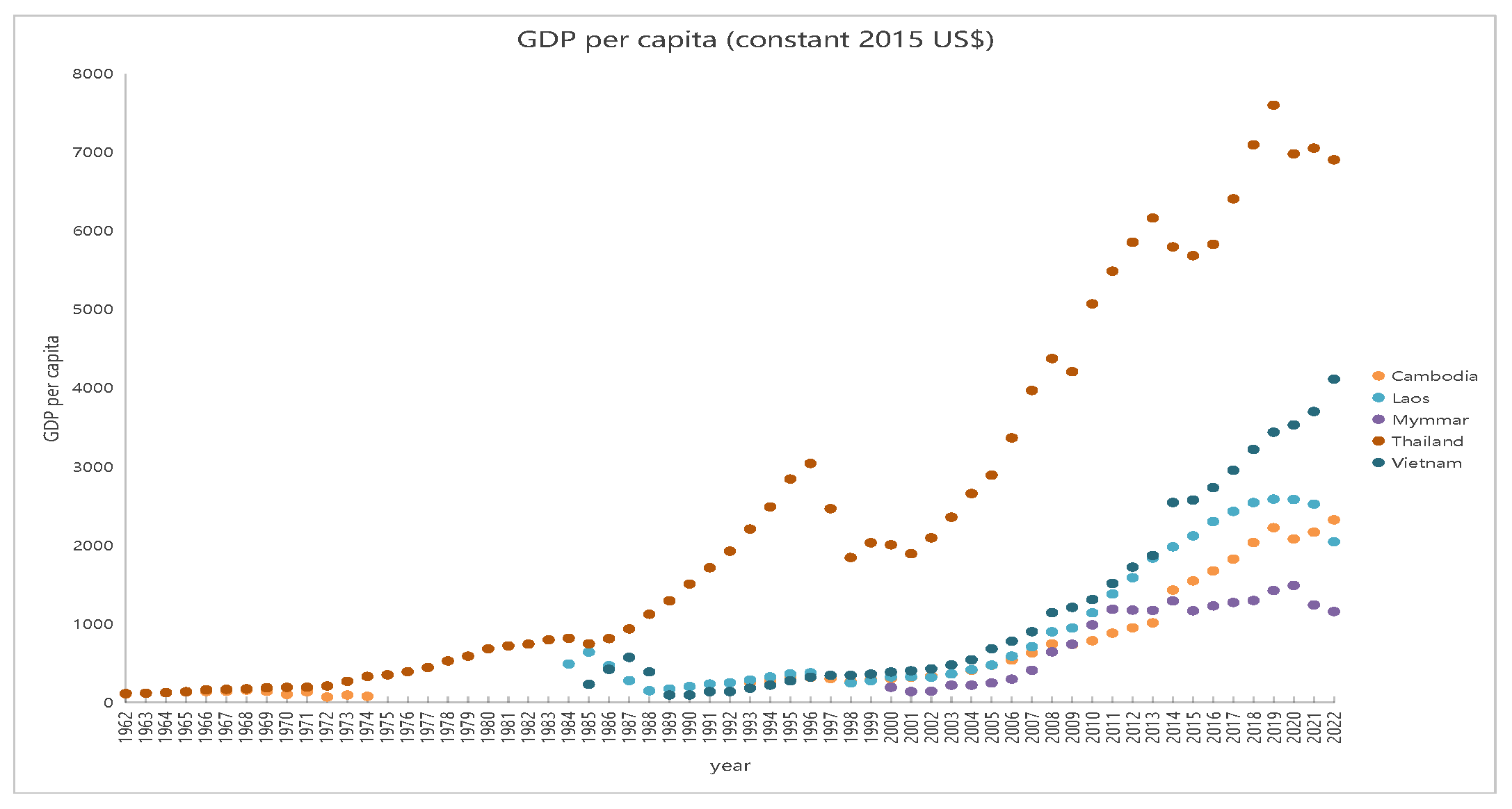 Economic capability, as measured by GDP per capita, directly affects a country’s ability to invest in flood mitigation infrastructure. Higher-income nations generally maintain more sophisticated drainage networks, early-warning systems, and disaster recovery funds. Thailand and Vietnam, both exhibiting rising GDP trends (