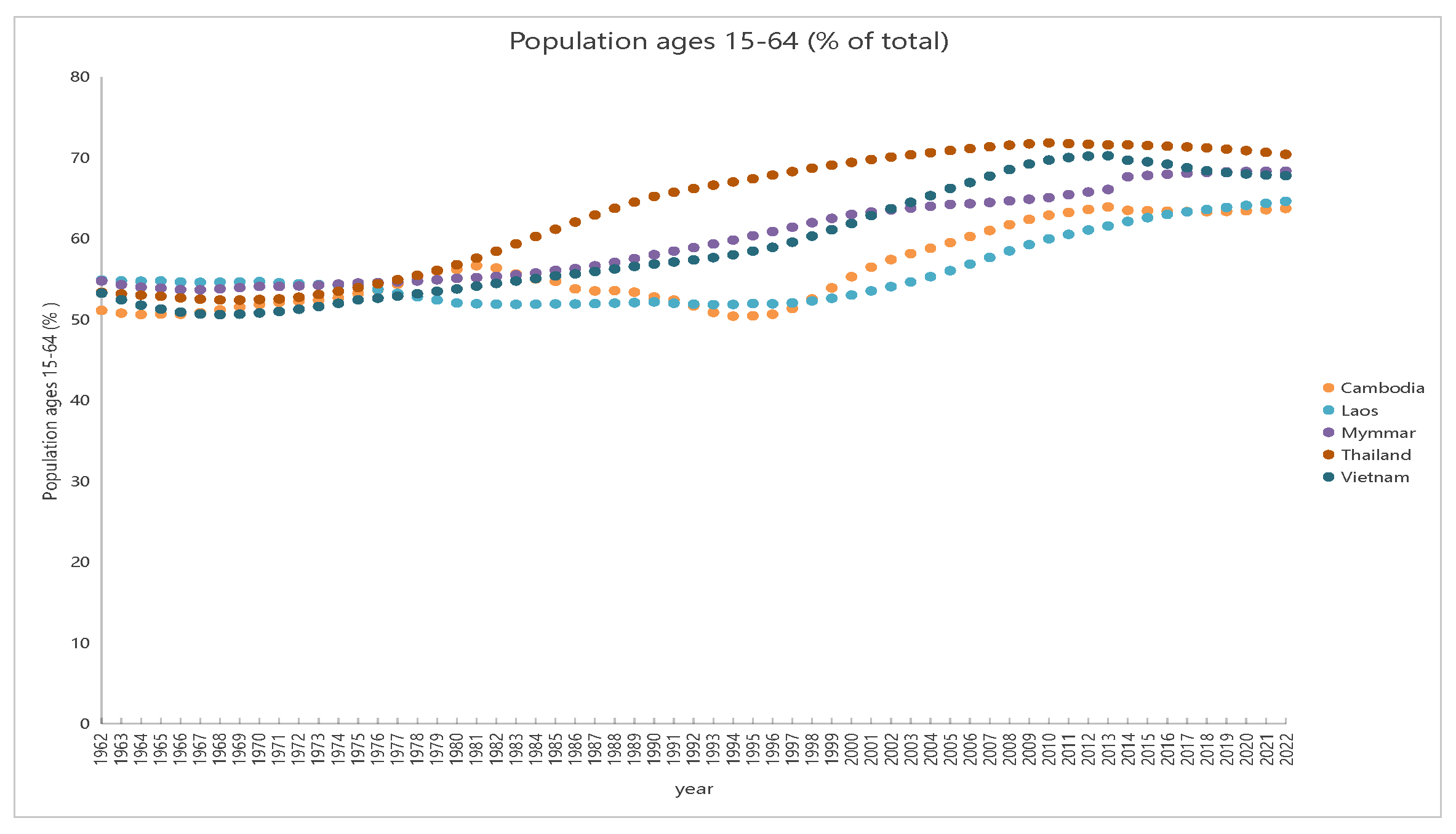 Since 2000, the proportion of the working-age population (aged 15–64) in Thailand (brown) and Vietnam (dark blue) has stabilized at around 70% of the total population; while the proportion of the working-age population in Cambodia (orange) and Laos (light blue) was initially relatively low. Then it showed an upward trend, gradually approaching 70% by 2020, and has remained relatively stable since then. This slowdown in the growth of the working-age population proportion suggests persistent challenges in labor force utilization.