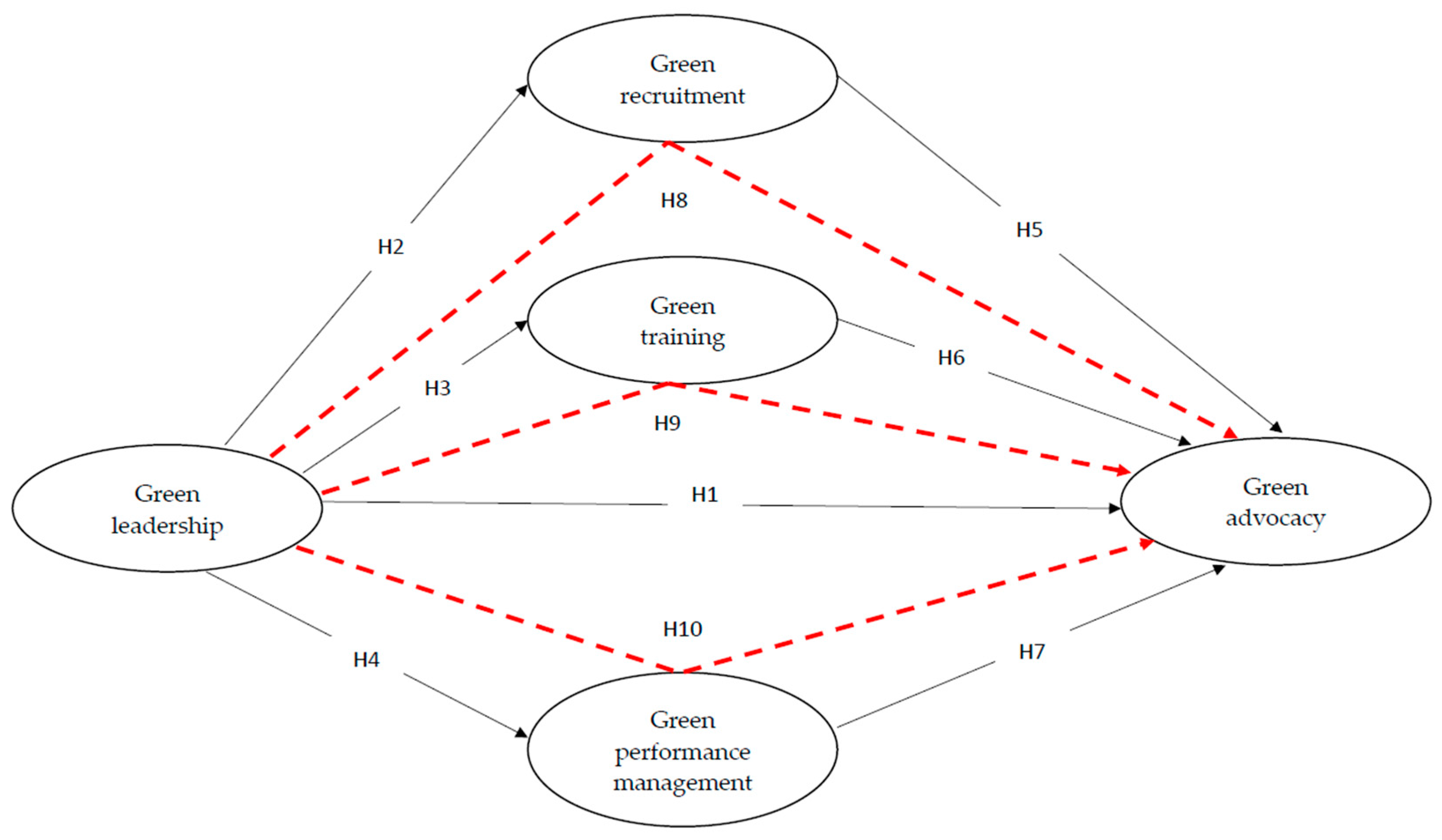 In light of the identified research gap, this study seeks to address the following core question: To what extent do GHRM practices mediate the relationship between green leadership and employees’ green advocacy within Saudi Arabia’s hospitality sector? Building on this premise, the research aims to explore how GHRM functions operate as a strategic conduit linking leadership-driven sustainability efforts to employee advocacy behaviors that support environmental and economic sustainability in tourism and hospitality organizations. Specifically, the study pursues four objectives: