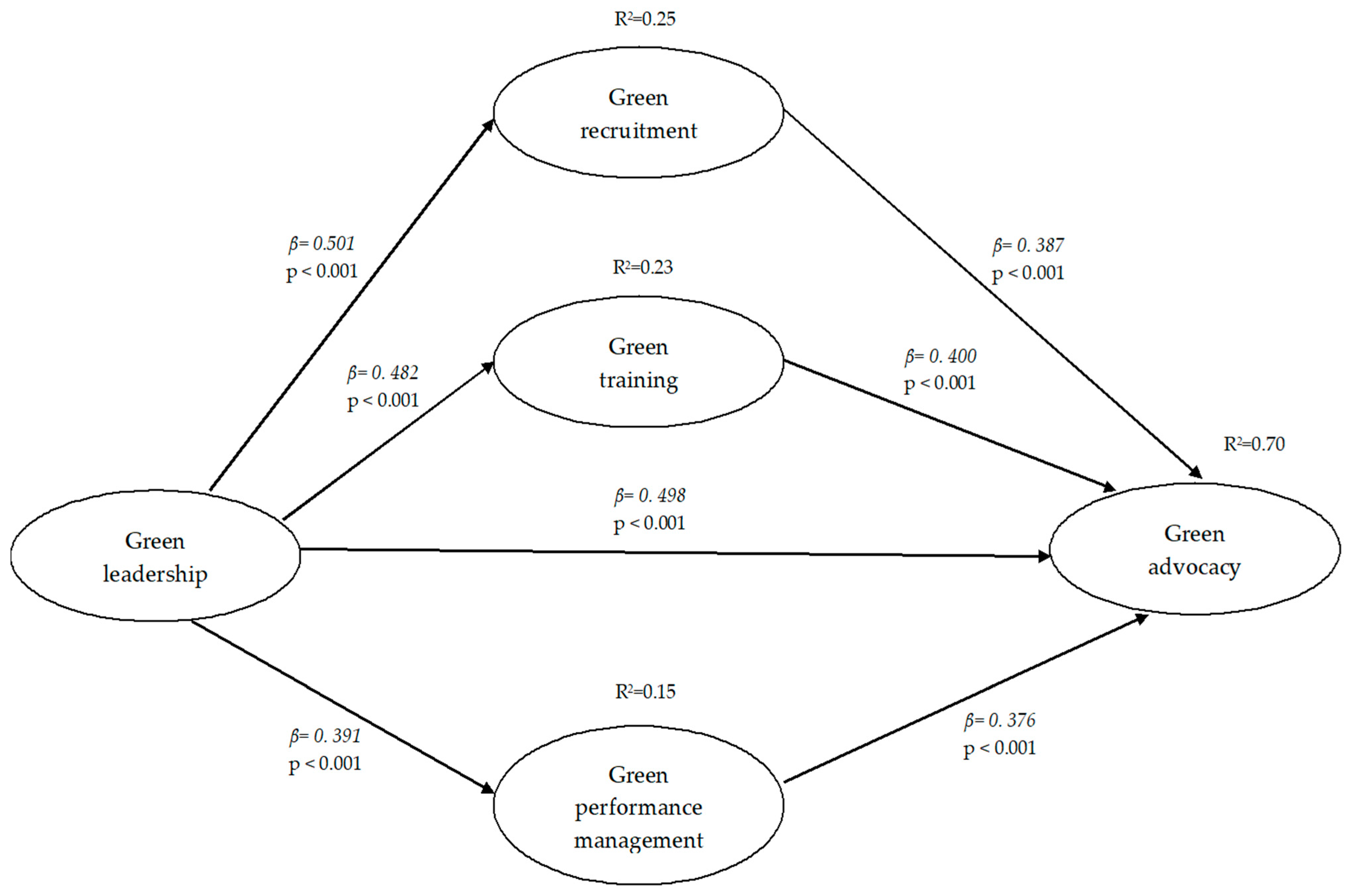 p-values less than 0.001. These findings provide strong empirical support for the proposed theoretical framework and confirm the robustness of the model. Specifically, Green Leadership exhibited a significant and positive effect on Green Advocacy (β = 0.498,