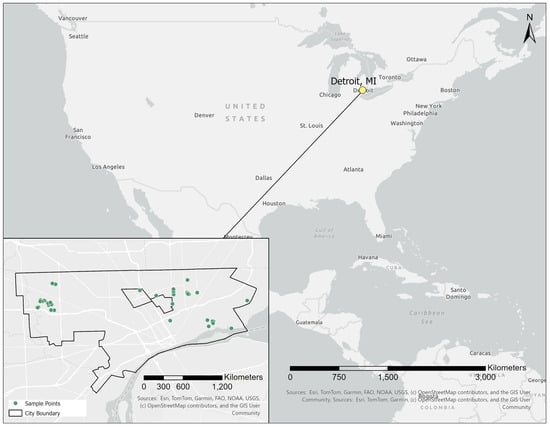 Land use—land cover (LULC) types in our sample set include residential and commercial vacant lots, parks, and public rights-of-way. The terrain in Detroit is generally gently sloping to flat topography that is inclined to the Southeast at a gradient of less than 0.2 m km−1 (ft mi−1). An initial list of potential vacant sites was supplied by the City of Detroit (ca. 180 sites), which we uploaded to a geographic information system, printed maps, and then did a windshield survey of each parcel in February 2013. We eliminated 130 sites due to a lack of safe access, obstruction of ingress and egress for tracked sampling equipment, or the structure was still on the parcel lot. From the 50 remaining available and accessible sites, we plotted them and found that they maximized geographic coverage to capture larger-scale variation in urbanized soil hydrology in Detroit and featured smaller clusters of sites to address smaller-scale variation in parcel-level hydrology (Figure 1). The final site selection was optimized on transit times among sites at an average pace of 3–4 sites per day for a 5-day workweek spent on each of the West and East sides of Detroit. This process led to a sample group that was stratified into a sampling plan by random factors, including availability (no structure on-site), restrictions due to safety concerns, and accessibility for equipment.