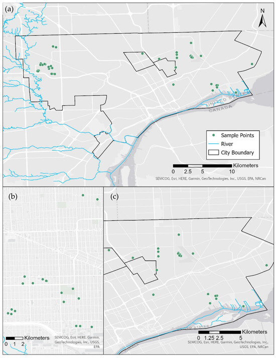 (Upper): Map shows international-national geographic context for study sites in Detroit, MI. (Lower): (a) Site location summary and nominal watersheds for River Rouge on the West and Detroit River on the right, (b) Westside parcels in the River Rouge watershed, and (c) Eastside locations in the Detroit River watershed. Note that several neighborhoods on the West and East sides have clusters of parcels.