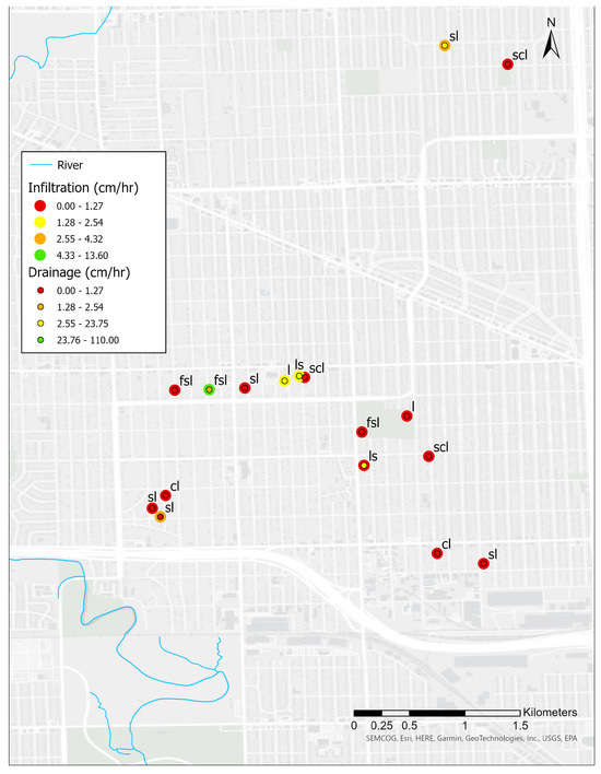 Hydrologic data was sorted into bins, with the lowest value assigned to red, the next-highest to orange, the next-highest to yellow, and then the highest values sorted into the green bin. The numerical ranges (bins) for hydrologic data were set according to nominal expectations for stormwater management using gray-green hydrology. The lowest end of color scales (i.e., red) for both infiltration and drainage rates is set at ≤1.27 cm h−1 (or ½ inch h−1). These are by nature the most frequent storm events (i.e., 1- and 2-year return periods) and have among the lowest total event rainfall depths with varying intensity [14,15]. The next higher bin starts at 1.28 cm h−1 and ends at ≤2.54 cm h−1 (or 1 inch h−1), and so on, using 2.54 cm h−1 to delineate between lower and higher ranges for both infiltration and drainage rates.