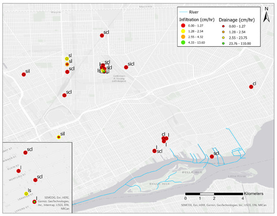 Eastside Detroit River watershed with parcel locations and symbology according to infiltration rate (outer circle), and drainage rate (inner circle). Text abbreviations are soil textural class for surface soils (cl = clay loam, fsl = fine sandy loam, l = loam, ls = loamy sand, scl = sandy clay loam, sicl = silty clay loam, sil = silt loam, sl = sandy loam).