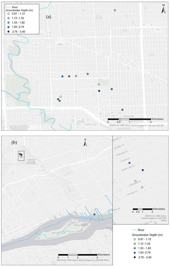 Groundwater depths observed at parcel scale for: (a) the Westside River Rouge (upper branch) catchment, and (b) the Eastside Detroit River catchment.