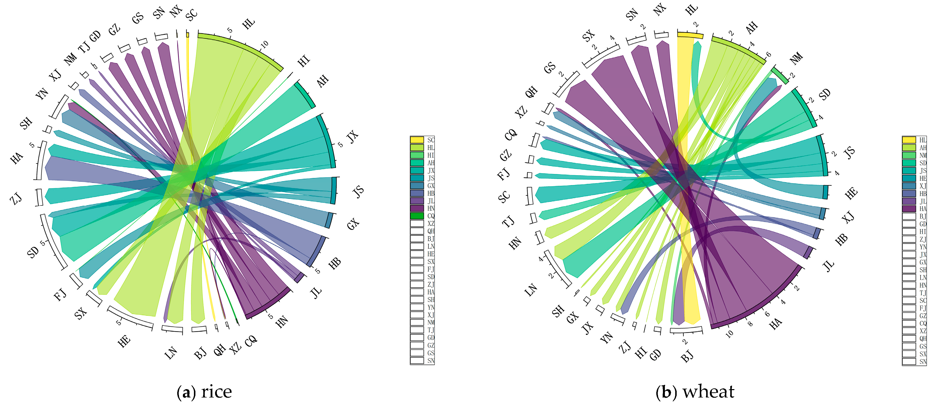 - Guide the flow of virtual water through the optimization and adjustment of grain production and circulation. The government should strengthen macro-level regulation over grain production and circulation to adjust the main channels of virtual water flows and enhance policy support for major exporting provinces. The results reveal a distinct “north-to-south water transfer” pattern in China’s virtual water flows embedded in interprovincial grain product trade. The top three provinces in terms of net virtual water outflow are Heilongjiang (43.166 billion m3), Henan (18.974 billion m3), and Jilin (12.675 billion m3). These major grain-exporting provinces export substantial volumes of virtual water through grain product trade, which significantly increases local water stress. For example, Heilongjiang’s water stress index rises by 94.74% due to grain exports. Although interprovincial grain product trade reduces the national average water stress index from 0.52 to 0.43 (a decrease of about 17.31%), indicating an overall mitigation effect and a relatively sustainable pattern, it simultaneously leads to spatial imbalance—some major exporting provinces experience aggravated water stress. Therefore, the government should fully exercise its regulatory capacity to rationally guide the main channels of virtual water transfer. For the largest interprovincial virtual water flows (e.g., Henan→Hebei, Inner Mongolia→Hunan, Heilongjiang→Hubei), targeted policy measures should be implemented to standardize grain circulation, lower logistics costs, and ensure the efficiency of major grain transportation routes. Meanwhile, stronger policy support—through direct subsidies, tax reductions, and low-interest loans—should be provided to key net-exporting provinces such as Henan and Inner Mongolia. By ensuring both food and water security, such measures would incentivize stable and increased grain production while alleviating local water stress, thereby enhancing the sustainability of interprovincial virtual water flows.