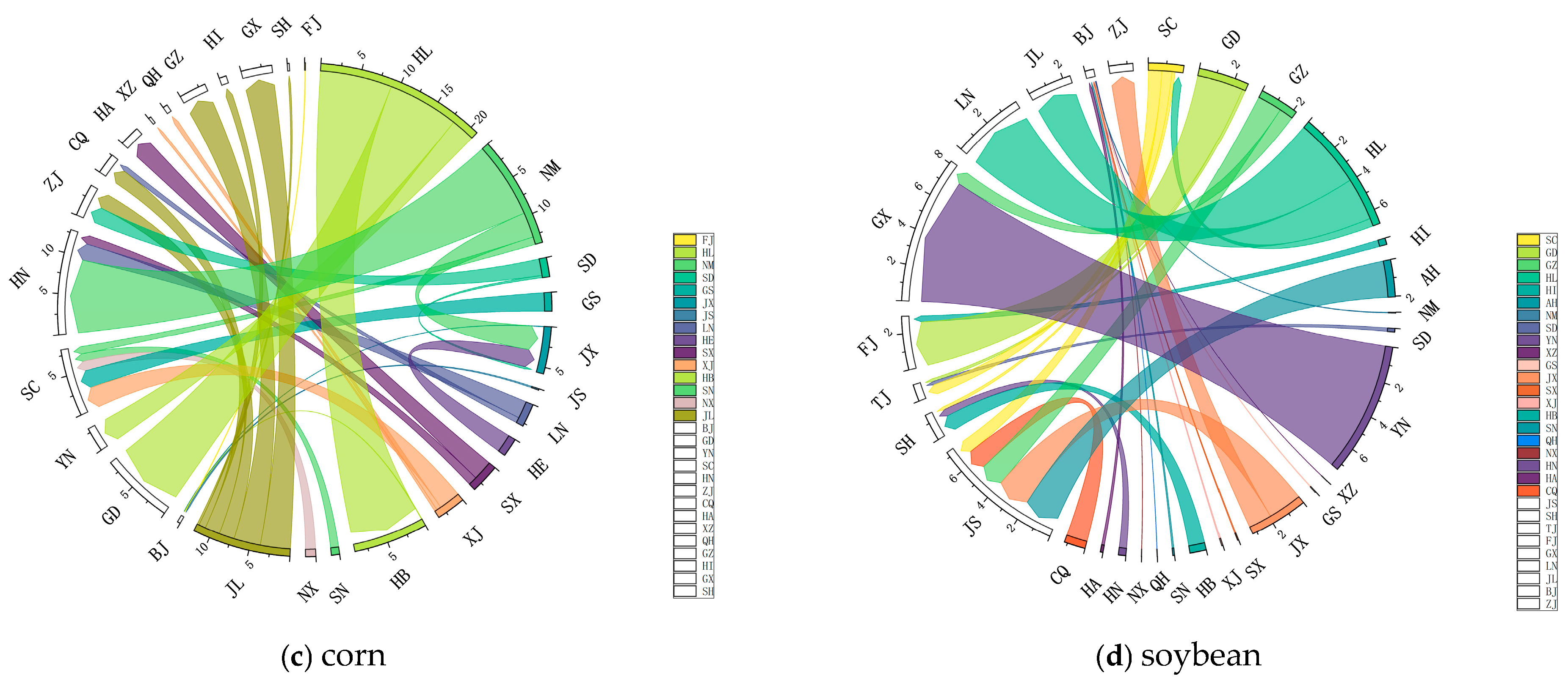 - Among the pairwise inter-provincial virtual water flows in China’s grain product trade, the flow from Henan to Hebei was the largest (15.062 billion m3), followed by the flow from Inner Mongolia to Hunan (9.568 billion m3) and the flow from Heilongjiang to Hubei (9.040 billion m3). By grain product type: among the pairwise inter-provincial virtual water flows of rice, the flow from Heilongjiang to Hebei was the largest (7.567 billion m3), followed by the flow from Anhui to Shandong (4.817 billion m3); among the inter-provincial virtual water net flows of wheat, the flow from Henan to Shanxi was the largest (4.196 billion m3), followed by the flow from Henan to Gansu (3.372 billion m3); among the inter-provincial virtual water flows of corn, the flow from Inner Mongolia to Hunan was the largest (9.568 billion m3), followed by the flow from Heilongjiang to Hubei (9.040 billion m3); among the inter-provincial virtual water flows of soybeans, the flow from Yunnan to Guangxi was the largest (7.355 billion m3), followed by the flow from Heilongjiang to Liaoning (3.948 billion m3).