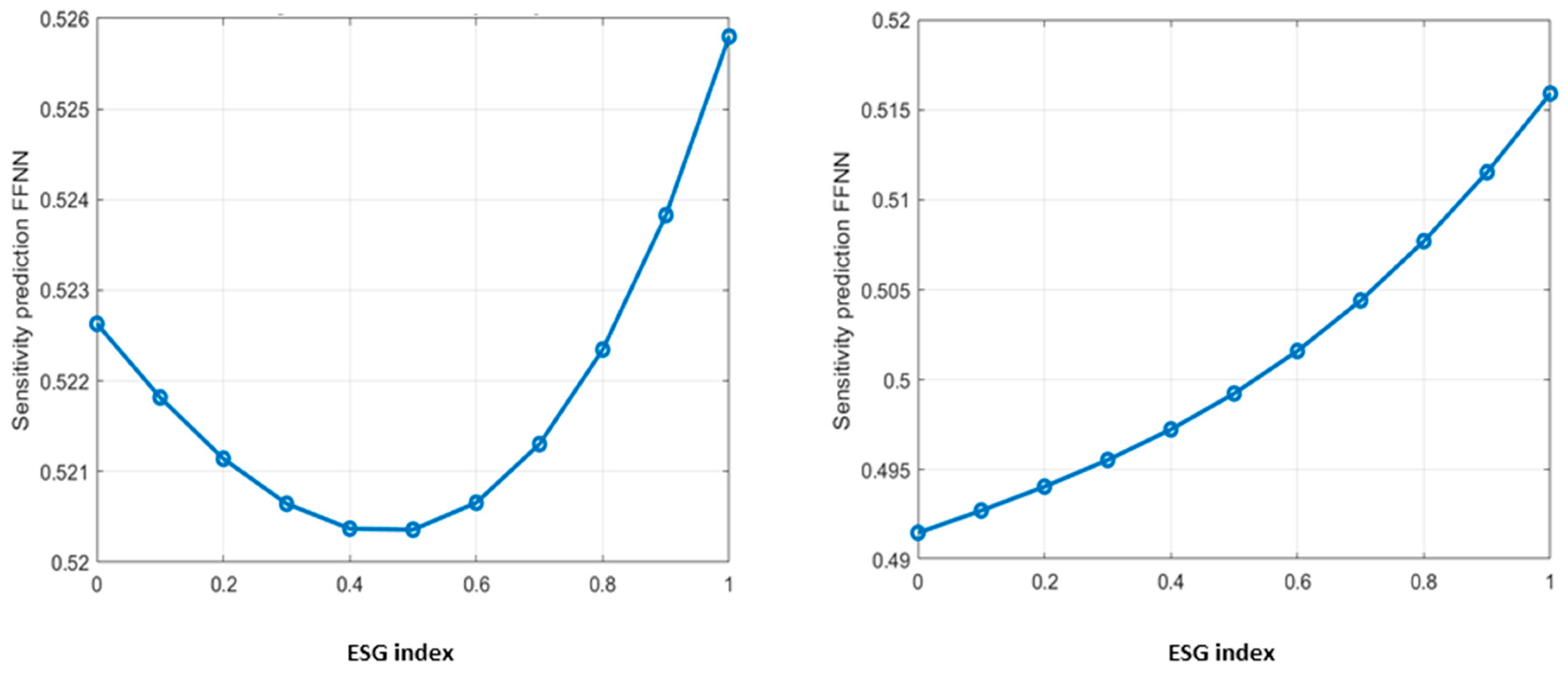 The ROE curve (right), in contrast, demonstrates a monotonic increasing pattern. While the increase is more gradual for ESG values below 0.5, the slope becomes steeper beyond this midpoint, indicating an accelerated positive effect of ESG on equity returns at higher ESG levels. This smoother shape with fewer nonlinear fluctuations aligns with the lower predictive power of the FFNN model for ROE, implying that ESG performance explains ROE less intricately than it does for ROA. Nevertheless, the curve still reflects a positive and economically meaningful relationship, supporting the idea that high ESG performance contributes to better returns for shareholders—albeit in a more linear or delayed fashion.
