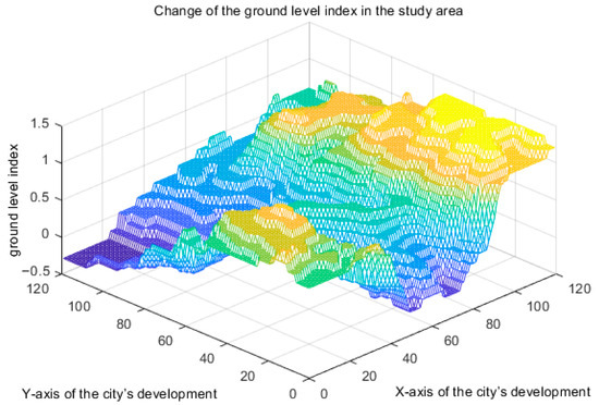 The change in geoenvironmental indicators in the research area, as the initial data for the study, adopted as the space of the agglomeration, is illustrated in Figure 2, Figure 3 and Figure 4. The X and Y axes of the charts represent a geometric grid with research fields of 25.0 × 25.0 m within the 3000 × 3000 m study area. The Z axes show the indicators of terrain elevation, groundwater level, and soil construction suitability, linearly rescaled according to the data presented in Table 1 and Table 2.