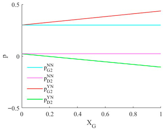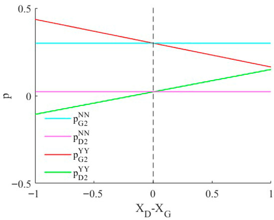 Firstly, as shown in Figure 2 and Figure 3, when only fresh product firm i engages in sales manipulation, the behavior benefits the product price of firm i, which is consistently higher than in the NN model. At the same time, this manipulation harms the competitor’s product price, making it consistently lower than under the NN model. Propositions 1 (1) and (2) have been verified. Secondly, as shown in Figure 4, under symmetric sales manipulation—when both fresh product firms engage in manipulation—the relative manipulation volume of firms D and G is negative impact with product G of the price and positive direction with product D. If firm i manipulates more, its product price will always be higher than in the case where neither firm manipulates, while the competitor’s product price will be lower than in the non-manipulated scenario. Finally, when neither firm engages in manipulation, the price of product G is always higher than that of product D, and since there is no manipulation involved, the product price remains unrelated to . Proposition 1 (3) has been verified.