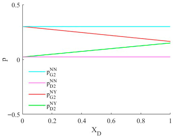 Since , , , is a concave function with respect to . Therefore, it has a maximum value. By setting the first derivative of with respect to equal to 0, the optimal product prices for fresh enterprises G and D in the second stage are: