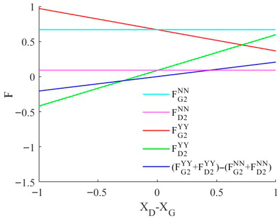 In the second stage, the consumer’s sales comparison utility is influenced by the relative sales of the two fresh product enterprises in the previous stage and the consumer’s preference for the relative sales of fresh products. Therefore, the consumer utility functions for purchasing products G and D in the second stage are: