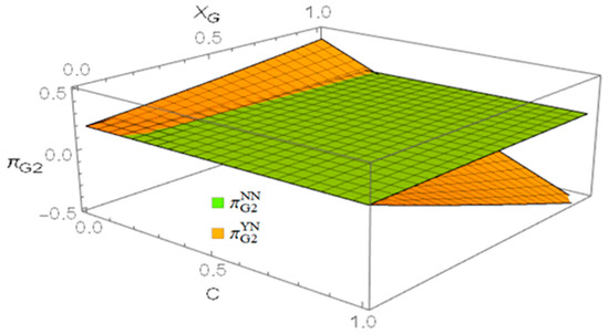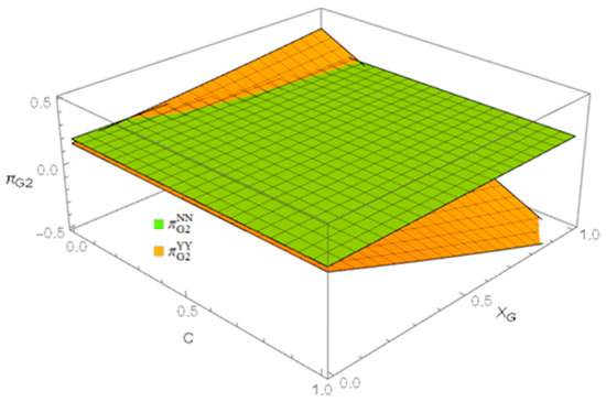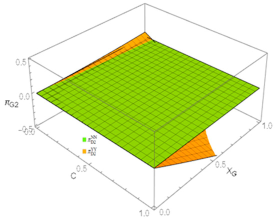 In this section, simulation analysis is used to further verify the propositions discussed earlier. The firm profits of the two firms under the YN model, NY model, and YY model are compared with those under the NN model through both two-dimensional and three-dimensional graphs, which are individually presented in Figure 8, Figure 9, Figure 10, Figure 11, Figure 12 and Figure 13 to provide clearer insights.