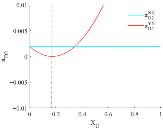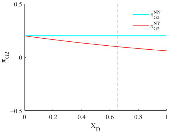 Substituting Equations (13)–(16) into Equation (12), the optimal enterprise profits of fresh product enterprise G and fresh product enterprise D in the second stage can be obtained: