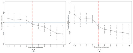 Results of the dynamic treatment effect. Subfigures (a) and (b), respectively, present the results of the parallel trend assumption test using per capita CO and per capita CO2 emissions as the dependent variables. The vertical red dashed line indicates the date when the TMCP policy was implemented, and the dashed bar represents the 95% confidence interval.