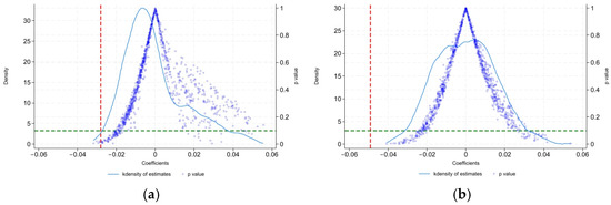 Results of the placebo test. Subfigures (a) and (b), respectively, present the results of the placebo test using per capita CO and per capita CO2 emissions as the dependent variables. The blue hollow circles and the blue solid line represent the p-values of the coefficient estimates and the kernel density, respectively. The vertical red dashed line indicates the actual estimated TMCP coefficient, while the green horizontal dashed line denotes the 10% significance level.