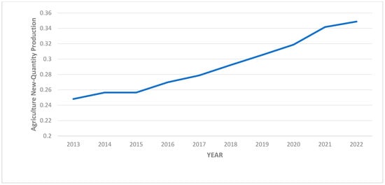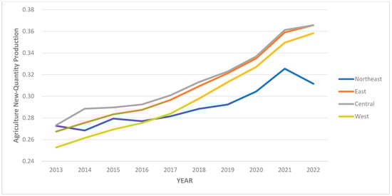 According to Figure 2 and Table 4 China’s agricultural new-quality productivity index rose from 0.248 in 2013 to 0.349 in 2022, exhibiting a stage-based upward trajectory. While the absolute increase in the ANQP index from 0.25 to 0.35 may seem modest, it corresponds to a relative growth of approximately 40% over the past decade. For a multidimensional composite index, such progress is considerable, as it reflects not only the adoption of new technologies but also deeper structural transformations within agricultural development. This sustained upward trajectory suggests that China’s agriculture has advanced from a relatively low level of innovation-driven productivity toward a more mature stage, carrying important implications for agricultural modernization and the improvement of rural well-being. Previous studies have shown that improvements in agricultural technology adoption and organizational innovation can significantly increase farm income [], enhance resource-use efficiency [], and promote environmentally sustainable practices [,], thereby translating productivity gains into tangible benefits for rural households.