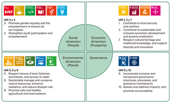 To guide actions towards truly sustainable development, the Principles for Responsible Investment in Agriculture and Food Systems (CFS-IRA), adopted by the Committee on World Food Security (CFS) in 2014, provide a fundamental framework [10]. These principles, aligned with the Sustainable Development Goals (SDGs), seek to guide the actors involved—governments, the private sector, civil society and academia—towards development that promotes food security, gender equality, resource conservation and inclusive governance [11,12]. The need to transform agri-food systems towards more sustainable and inclusive models has put the CFS-RAI Principles in the international debate [13,14,15,16,17]. These principles constitute a voluntary framework that guides States, the private sector, civil society, and international organizations in mobilizing investments that contribute to food security, inclusive rural development, and environmental sustainability [18].