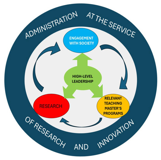 Figure 2 schematically presents this framework, illustrating this new paradigm of the research university, a model that defines it as a true engine of social transformation [40]. The model is based on five fundamental pillars that, together, create a dynamic institution that generates and disseminates knowledge to respond to the needs of society: (1) Research: it is the central pillar, conceived as an engine of knowledge aligned with the real problems and opportunities of Society; (2) Engagement with society: It reflects the real link between the university and its environment, ensuring that the knowledge generated has a positive impact; (3) Relevant teaching: Focused especially on postgraduate studies (master’s and doctorate), to train graduates with high intellectual, creative and innovative preparation; (4) Administrative support structure: An efficient governance support that is essential to sustain excellence in the other pillars; and (5) High-level leadership: strategic leadership capable of guiding the institution to meet the complex demands of this model [42].